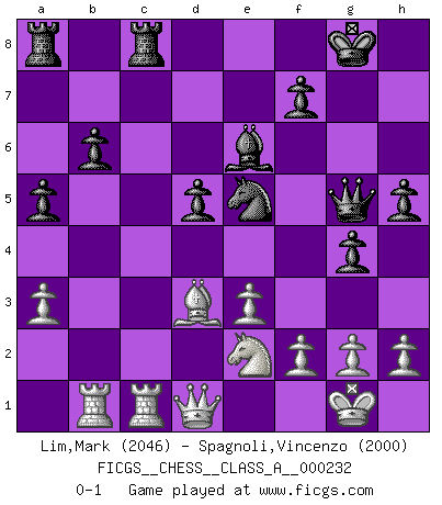 Last move : 0-1 2020 November 14 6:43:31 [Event "FICGS__CHESS__CLASS_A__000232"] [Site "FICGS"] [Date "2020.06.27"] [Round "1"] [White "Lim,Mark"] [Black "Spagnoli,Vincenzo"] [Result "0-1"] [WhiteElo "2046"] [BlackElo "2000"] 1.d4 Nf6 2.Nf3 d5 3.c4 e6 4.cxd5 exd5 5.Nc3 Bb4 6.Qa4+ Nc6 7.Bg5 h6 8.Bxf6 Qxf6 9.e3 O-O 10.Be2 Be6 11.O-O a6 12.Rfc1 Bd6 13.Qd1 Ne7 14.a3 Rfc8 15.Na4 b6 16.b4 a5 17.b5 h5 18.Nc3 g5 19.Ne5 g4 20.Bd3 Qg5 21.Ne2 c5 22.bxc6 Bxe5 23.dxe5 Nxc6 24.Rab1 Nxe5 0-1 This chess game has been lost on time (started : 2020.06.27 14:43:15) Follow this game move after move (download)It's just you and your opponent at the board and you're trying to prove something. (Bobby Fischer) Alles was ich jemals tun will ist Schach spielen. (Robert James Fischer) Por esta medida (el intervalo entre Fischer y sus contemporaneos), yo le considero el mas grande campeón mundial. (Garry Kasparov) L'ordinateur a tué l'originalité. Il n'y a plus guère d'aventures sur l'échiquier. (Jacob Murray) When you stop learning you start dying. (Scott Adams)