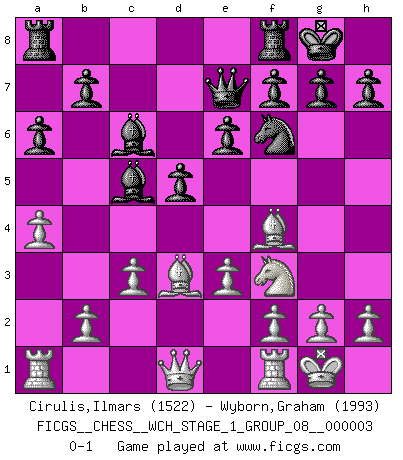 Last move : 0-1 2007 September 9 13:35:13 [Event "FICGS__CHESS__WCH_STAGE_1_GROUP_08__000003"] [Site "FICGS"] [Date "2007.07.11"] [Round "1"] [White "Cirulis,Ilmars"] [Black "Wyborn,Graham"] [Result "0-1"] [WhiteElo "1522"] [BlackElo "1993"] 1.d4 d5 2.Bf4 Nf6 3.Nf3 e6 4.e3 c5 5.Nc3 Be7 6.dxc5 Bxc5 7.Nb5 Na6 8.Be2 O-O 9.O-O Bd7 10.a4 Nb4 11.c3 Nc6 12.Bd3 a6 13.Nbd4 Qe7 14.Nxc6 Bxc6 0-1 This chess game has been lost on time (started : 2007.07.11 17:0:48) Queen's pawn, Mason variation Kingside Castling by player Black (move 8) Kingside Castling by player White (move 9) Player Black won this chess game. Follow this game move after move (download)Do you realize Fischer almost never has any bad pieces? He exchanges them, and the bad pieces remain with his opponents. (Yuri Balashov) Es war undenkbar für die Behörden, dass ein sowjetischer Großmeister auf diese Art und Weise [Fischer-Taimanov 6:0] verliert, ohne dass es eine politischer Erklärung dafür gäbe. (Mark Taimanov) No solamente yo pronostico su triunfo sobre Botvinnik, sino que me adelanto y digo que probablemente Fischer es el jugador de Ajedrez mas grande que haya existido. (John Collins) Ne tendez aucun piège pour le plaisir ! Ne jouez rien dans l'espoir que l'adversaire réagisse de façon stupide ! Prenez toujours pour acquis que l'adversaire va trouver le meilleur coup ! Ne jouez jamais de coup dans l'espoir que l'adversaire ne voie pas la menace ! Chacun de vos coups doit améliorer la position d'une façon ou d'une autre. However beautiful the strategy, you should occasionally look at the results. (Winston Churchill)