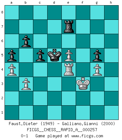 Last move : 0-1 2020 September 2 14:52:0 [Event "FICGS__CHESS__RAPID_A__000257"] [Site "FICGS"] [Date "2020.06.29"] [Round "1"] [White "Faust,Dieter"] [Black "Galliano,Gianni"] [Result "0-1"] [WhiteElo "1949"] [BlackElo "2000"] 1.e4 e5 2.Nf3 Nc6 3.Bb5 Nf6 4.O-O Nxe4 5.d4 Nd6 6.Bxc6 dxc6 7.dxe5 Nf5 8.Qxd8+ Kxd8 9.Nc3 Bd7 10.b3 Kc8 11.Bb2 Be7 12.Rad1 b6 13.Rd2 a5 14.a4 Bb4 15.Rfd1 Be6 16.Ng5 c5 17.Rd3 Bxc3 18.Rxc3 Kb7 19.Rcd3 h5 20.g3 Rae8 21.Kg2 Rhf8 22.h3 Bc8 23.f4 f6 24.Nf3 Re7 25.Rg1 fxe5 26.Bxe5 Rfe8 27.Rgd1 Nd6 28.Re1 Bf5 29.Rd2 c4 30.Rde2 Bd7 31.Kh2 Nf7 32.Kg2 Be6 33.Re3 cxb3 34.cxb3 Bd5 35.Kf2 g5 36.g4 hxg4 37.hxg4 c5 38.Nd2 Nxe5 39.fxe5 Rf8+ 40.Kg3 Rf4 41.Ne4 Bxe4 42.Rxe4 Rxe4 43.Rxe4 Kc6 44.Kf3 Kd5 0-1 Ruy Lopez : Berlin defense, Open variation Kingside Castling by player White (move 4) Player Black won this chess game. Follow this game move after move (download)Bobby Fischer is the greatest Chess genius of all time ! (Alexander Kotov) Moralische Siege zählen nicht. (Savielly Grigorievitsch Tartakower) ¿Cual es el objetivo de jugar una apertura de gambito?... Para adquirir una reputación de ser un jugador apuesto a costo de perder el juego. (Siegbert Tarrasch) Les Echecs ne sont pas pour les âmes timides. Ils requièrent un homme entier, qui ne s'arrête pas aveuglément à ce qui a été déjà établi, mais qui tente individuellement de sonder les profondeurs du jeu. (W. Steinitz) Rules and bones are meant to be broken. (Anonymous)