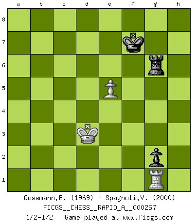 Last move : 1/2-1/2 2020 July 20 17:32:23 [Event "FICGS__CHESS__RAPID_A__000257"] [Site "FICGS"] [Date "2020.06.29"] [Round "1"] [White "Gossmann,Ewald"] [Black "Spagnoli,Vincenzo"] [Result "1/2-1/2"] [WhiteElo "1969"] [BlackElo "2000"] 1.e4 Nf6 2.e5 Nd5 3.d4 d6 4.Nf3 Bg4 5.Be2 e6 6.c4 Nb6 7.O-O Be7 8.Nc3 O-O 9.h3 Bxf3 10.Bxf3 Nc6 11.Bxc6 bxc6 12.b3 dxe5 13.dxe5 Qxd1 14.Rxd1 a5 15.Be3 a4 16.Bxb6 cxb6 17.Nxa4 b5 18.cxb5 cxb5 19.Nc3 b4 20.Na4 Ra7 21.Rac1 h5 22.g3 h4 23.gxh4 Bxh4 24.Kg2 Be7 25.Rc6 Kh7 26.Rd2 g5 27.Rdc2 Re8 28.Nb6 Kg6 29.Nd5 Bf8 30.Rb6 Rea8 31.Nxb4 Bxb4 32.Rxb4 Rxa2 33.Rc3 Re2 34.Rb5 Ra7 35.b4 Rd7 36.Rf3 Rc7 37.Rf6+ Kg7 38.Rf3 Re1 39.Rg3 Kh6 40.Rb3 R7c1 41.Rb8 Rxe5 42.b5 R1c5 43.b6 Rb5 44.Rxb5 Rxb5 45.Kf3 Kg7 46.Ke3 f5 47.Kd3 e5 48.Kc4 Rb2 49.f3 e4 50.fxe4 g4 51.hxg4 fxg4 52.e5 g3 53.Rd8 g2 54.Rd1 Rxb6 55.Rg1 Rg6 56.Kd3 Kf7 1/2-1/2 Alekhine's defense : Modern variation, 4...Bg4 Kingside Castling by player White (move 7) Kingside Castling by player Black (move 8) 10 pieces endgame at move 44 : White KRPPP , Black KRPPP WHITE : King + 1 Rook 3 Pawns BLACK : King + 1 Rook 3 Pawns 9 pieces endgame at move 50 : White KRPPP , Black KRPP WHITE : King + 1 Rook 3 Pawns BLACK : King + 1 Rook 2 Pawns 8 pieces endgame at move 51 : White KRPPP , Black KRP WHITE : King + 1 Rook 3 Pawns BLACK : King + 1 Rook 1 Pawn 7 pieces endgame at move 51 : White KRPP , Black KRP WHITE : King + 1 Rook 2 Pawns BLACK : King + 1 Rook 1 Pawn 6 pieces endgame at move 54 : White KRP , Black KRP WHITE : King + 1 Rook 1 Pawn BLACK : King + 1 Rook 1 Pawn This chess game ended in a draw. Follow this game move after move (download)Chess is like war on a board. (Bobby Fischer) Ich hatte Angst gegen einen russischen Großmeister zu verlieren, und er befürchtete gegen einen kleinen Jungen zu verlieren. (über ein Remis gegen Juri Awerbach). (Robert James Fischer) Aunque la mayoría de la gente disfruta observar las partidas de los grandes Maestros de ataque, algunos de los jugadores mas notables en la historia han sido los jugadores silenciosos posicionales. Lentamente ellos te aplastan despojandote de tu espacio, congestionando tus piezas y dejandote virtualmente sin nada que hacer. (Yasser Seirawan) Des combinaisons [dans le jeu d'échecs] pareilles à des mélodies. Je crois entendre pour ainsi dire la musique des coups... (Vladimir Nabokov) Nobody is always a winner, and anybody who says he is, is either a liar or doesn't play poker. (Amarillo Slim)