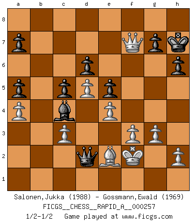 Last move : 1/2-1/2 2020 August 3 8:58:20 [Event "FICGS__CHESS__RAPID_A__000257"] [Site "FICGS"] [Date "2020.06.29"] [Round "1"] [White "Salonen,Jukka"] [Black "Gossmann,Ewald"] [Result "1/2-1/2"] [WhiteElo "1988"] [BlackElo "1969"] 1.d4 Nf6 2.c4 e6 3.Nc3 Bb4 4.e3 O-O 5.Bd3 c5 6.Nf3 b6 7.O-O Bb7 8.Na4 d6 9.a3 Ba5 10.Rb1 Na6 11.Nd2 Qd7 12.Nc3 Rad8 13.f3 Bxc3 14.bxc3 Nb8 15.a4 Nc6 16.Nb3 h6 17.e4 Ba6 18.Be3 Rb8 19.Qd2 e5 20.Rfc1 Na5 21.Nxa5 bxa5 22.Qf2 Rxb1 23.Rxb1 Rc8 24.d5 Qe7 25.Qg3 Kh8 26.Qh3 Nd7 27.g3 Rb8 28.Rxb8+ Nxb8 29.Be2 Nd7 30.Bg5 Qxg5 31.Qxd7 Qc1+ 32.Kf2 Qd2 33.Qe8+ Kh7 34.Qxf7 Bxc4 1/2-1/2 Nimzo-Indian : 4.e3 O-O, 5.Bd3 Kingside Castling by player Black (move 4) Kingside Castling by player White (move 7) This chess game ended in a draw. Follow this game move after move (download)The older I grow, the more I value pawns. (Paul Keres) Um dein Spiel zu verbessern musst du zuallererst das Endspiel studieren, denn diese kann unabhängig studiert werden. Die Eröffnung und das Mittelspiel müssen immer in Bezug gesetzt werden zum Endspiel. (José Raúl Capablanca) La última cosa en que Fischer estaba interesado era en tonterías, siempre y cuando el Ajedrez estuviera involucrado. (Elie Agur) Karpov est une pièce de musée. (Garry Kasparov) The only thing that overcomes hard luck is hard work. (Harry Golden)