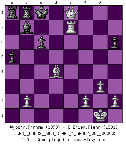 Last move : 1-0 2007 September 23 6:45:42 [Event "FICGS__CHESS__WCH_STAGE_1_GROUP_08__000003"] [Site "FICGS"] [Date "2007.07.11"] [Round "1"] [White "Wyborn,Graham"] [Black "O Brien,Glenn"] [Result "1-0"] [WhiteElo "1993"] [BlackElo "1391"] 1.d4 d5 2.c4 e6 3.Nc3 Nf6 4.Nf3 c6 5.e3 Nbd7 6.Qc2 Bd6 7.Bd2 O-O 8.Bd3 dxc4 9.Bxc4 b5 10.Bd3 Bb7 11.Ng5 h6 12.Nge4 Be7 13.Nxf6+ Nxf6 14.Ne4 Nxe4 15.Bxe4 Bd6 16.O-O f5 17.Bf3 Qc7 18.g3 a5 19.Rac1 Ra6 20.a4 bxa4 21.Qxa4 Rb8 22.Rc2 g6 23.e4 fxe4 24.Bxe4 Kg7 25.Bd3 R6a8 26.d5 exd5 27.Bc3+ Kh7 28.Bxg6+ Kxg6 29.Qg4+ Kh7 30.Qf5+ Kg8 31.Qg6+ Kf8 32.Re2 d4 33.Bxd4 Qe7 34.Rxe7 Kxe7 35.Re1+ Kd7 36.Qf7+ Be7 37.Rxe7+ Kc8 38.Qe8+ 1-0 Comment by player 1 : Graham Wyborn : Thanks 4 the game QGD Semi-Slav : Stoltz variation Kingside Castling by player Black (move 7) Kingside Castling by player White (move 16) Player White won this chess game. Follow this game move after move (download)It is the aim of the modern school, not to treat every position according to one general law, but according to the principle inherent in the position. (Richard Reti) Im Leben werden Partien nie so unstrittig gewonnen wie im Spiel (Emanuel Lasker) No existe un remordimiento como el remordimiento del Ajedrez. (H. G. Wells) Le système Elo représente seulement une moyenne. Il est simplement un indicateur de votre stabilité. (Anatoli Karpov) Philosophers use a language that is already deformed as though by shoes that are too tight. (Ludwig Wittgenstein)