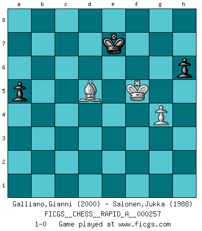 Last move : 1-0 2020 September 6 8:45:32 [Event "FICGS__CHESS__RAPID_A__000257"] [Site "FICGS"] [Date "2020.06.29"] [Round "1"] [White "Galliano,Gianni"] [Black "Salonen,Jukka"] [Result "1-0"] [WhiteElo "2000"] [BlackElo "1988"] 1.e4 e5 2.Nf3 Nc6 3.Bb5 a6 4.Ba4 Nf6 5.O-O Be7 6.Re1 b5 7.Bb3 d6 8.c3 O-O 9.h3 Na5 10.Bc2 c5 11.d4 Qc7 12.Nbd2 cxd4 13.cxd4 Bb7 14.d5 Rfc8 15.Bd3 Nd7 16.Nf1 Nc4 17.b3 Ncb6 18.Bd2 Nc5 19.Rc1 Qd7 20.Bb1 f5 21.Ba5 fxe4 22.Bxb6 exf3 23.Qxf3 g6 24.Qg3 Bf8 25.Bxc5 Rxc5 26.Rxc5 dxc5 27.h4 Bh6 28.h5 Bf4 29.Qc3 gxh5 30.Be4 Rf8 31.Qxc5 h4 32.a4 h3 33.g3 Bg5 34.Nh2 bxa4 35.bxa4 Rc8 36.Qb6 Kg7 37.Nf3 Bf6 38.Qe3 h6 39.Rb1 Rc4 40.Kh2 Qf7 41.Nh4 Bc8 42.Nf5+ Bxf5 43.Bxf5 Qxd5 44.Qa7+ Kf8 45.Bxh3 Bd8 46.Rb7 Qf3 47.Be6 Rc7 48.Rxc7 Bxc7 49.Qc5+ Ke8 50.Qxc7 Qxf2+ 51.Kh3 Qf1+ 52.Kg4 Qd1+ 53.Kf5 Qh5+ 54.Ke4 Qe2+ 55.Kd5 Qd3+ 56.Kc6 Qe4+ 57.Bd5 Qxa4+ 58.Kd6 Qb4+ 59.Kxe5 Qe7+ 60.Qxe7+ Kxe7 61.g4 a5 62.Kf5 1-0 Ruy Lopez : Closed Kingside Castling by player White (move 5) Kingside Castling by player Black (move 8) 10 pieces endgame at move 50 : White KQBPP , Black KQPPP WHITE : King + 1 Queen 1 Bishop 2 Pawns BLACK : King + 1 Queen 3 Pawns 9 pieces endgame at move 57 : White KQBP , Black KQPPP WHITE : King + 1 Queen 1 Bishop 1 Pawn BLACK : King + 1 Queen 3 Pawns 8 pieces endgame at move 59 : White KQBP , Black KQPP WHITE : King + 1 Queen 1 Bishop 1 Pawn BLACK : King + 1 Queen 2 Pawns 7 pieces endgame at move 60 : White KQBP , Black KPP WHITE : King + 1 Queen 1 Bishop 1 Pawn BLACK : King + 2 Pawns 6 pieces endgame at move 60 : White KBP , Black KPP WHITE : King + 1 Bishop 1 Pawn BLACK : King + 2 Pawns Player White won this chess game. Follow this game move after move (download)I am the best player in the world and I am here to prove it. (Bobby Fischer) Die Neutralität betrachte ich als eine schwere Krankheit. (Viktor Kortschnoi) Debemos de asegurarnos de que el Ajedrez no se convierta en un lenguaje muerto, muy interesante, pero tan solo para un grupo muy pequeño. (Sytze Faber) Les réformistes prétendent que les progrès de la théorie conduiront à la disparition des échecs, et qu'il faut, pour leur rendre vie, en remanier les règles. En réalité, qu'exprime cette affirmation? Le mépris de l'intuition, de l'imagination et de tous les autres éléments qui font des échecs un art. (Alexander Alekhine) Nowadays, anyone who cannot speak English and is incapable of using the Internet is regarded as backward. (Al-Waleed bin Talal)