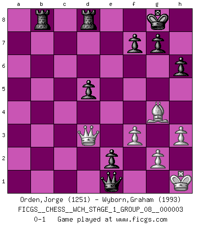 Last move : 0-1 2007 August 25 15:13:31 [Event "FICGS__CHESS__WCH_STAGE_1_GROUP_08__000003"] [Site "FICGS"] [Date "2007.07.11"] [Round "1"] [White "Orden,Jorge"] [Black "Wyborn,Graham"] [Result "0-1"] [WhiteElo "1251"] [BlackElo "1993"] 1.e4 c5 2.Nf3 Nc6 3.d4 cxd4 4.Nxd4 e5 5.Nxc6 bxc6 6.c4 Nf6 7.Nc3 Bc5 8.Be2 Qb6 9.O-O Bd4 10.Na4 Qd8 11.Bf3 Ba6 12.Qc2 d5 13.exd5 cxd5 14.Bg5 Bxc4 15.Rfd1 O-O 16.a3 Rb8 17.b4 Bxa1 18.Rxa1 h6 19.Bxf6 Qxf6 20.Nb2 e4 21.Bg4 Bd3 22.Qd2 a5 23.Rd1 axb4 24.axb4 Bb5 25.h3 Rfd8 26.f3 e3 27.Qc2 e2 28.Re1 Qd4+ 29.Kh1 Qxb4 30.Nd3 Bxd3 31.Qxd3 Qxe1+ 0-1 Sicilian : Labourdonnais-Loewenthal variation Kingside Castling by player White (move 9) Kingside Castling by player Black (move 15) Player Black won this chess game. Follow this game move after move (download)I play correspondence chess because it is both art and science while chess is art only. (A player at FICGS) Ich brauche nur einen Blick auf das Schachbrett zu werfen, und weiß schon, was in der Stellung steckt, was geschehen kann und was geschehen wird. Alle übrigen suchen und prüfen, ich aber weiß es! (José Raúl Capablanca) Existen dos clases de sacrificios: los correctos y los míos. (Mikhail Tal) Le temps de noter son nom sur la feuille de partie, j'étais déjà en zeitnot ! D'un modeste amateur apparié lors de la première ronde d'un open contre le grand-maître Azmaïparashvili. Hardware: the parts of a computer that can be kicked. (Jeff Persis)