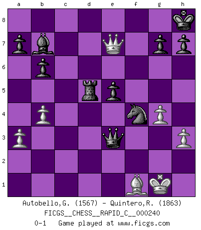 Last move : 0-1 2020 September 23 23:24:28 [Event "FICGS__CHESS__RAPID_C__000240"] [Site "FICGS"] [Date "2020.06.29"] [Round "1"] [White "Autobello,Giovanni"] [Black "Quintero,Raul"] [Result "0-1"] [WhiteElo "1567"] [BlackElo "1863"] 1.c4 c5 2.Nc3 Nf6 3.g3 d5 4.cxd5 Nxd5 5.Bg2 Nc7 6.Nf3 Nc6 7.O-O e5 8.d3 Be7 9.b3 O-O 10.Bb2 f6 11.Rc1 Qd7 12.a3 b6 13.Qc2 Bb7 14.h3 Rac8 15.e3 Kh8 16.g4 Ne6 17.Rfd1 Rfd8 18.Nh4 Ncd4 19.exd4 cxd4 20.b4 dxc3 21.Bxc3 Nf4 22.Bf1 Qd5 23.f3 f5 24.Nxf5 Qxf3 25.Qh2 Rxc3 26.Nxe7 Rxc1 27.Rxc1 Qe3+ 28.Qf2 Qxc1 29.Qh4 Rxd3 30.Nd5 Rxd5 31.Qe7 Qe3+ 0-1 English : Symmetrical, Rubinstein system Kingside Castling by player White (move 7) Kingside Castling by player Black (move 9) Player Black won this chess game. Follow this game move after move (download)It was clear to me that the vulnerable point of the American Grandmaster (Bobby Fischer) was in double-edged, hanging, irrational positions, where he often failed to find a win even in a won position. (Efim Geller) Je mehr ich von der FIDE weiss, um so weniger verstehe ich. (Alexander Kalifman) Alguna parte de un error es siempre correcto. (Savielly Tartakover) Les écrivains ont utilisé les échecs pour analyser les côtés extrêmes de la nature humaine. Dans ce cadre, les échecs offrent un champ d'expérimentation idéal. Mais on pourrait faire la même chose avec la peinture. Et là, en vous référant à Van Gogh, vous ne tirerez pas de conclusion définitive sur les peintres. (Gary Kasparov) Cactus - It is depressed cucumber. (Ilmars Cirulis)