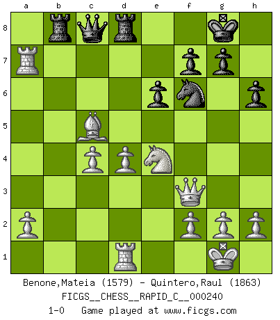 Last move : 1-0 2020 July 26 5:49:25 [Event "FICGS__CHESS__RAPID_C__000240"] [Site "FICGS"] [Date "2020.06.29"] [Round "1"] [White "Benone,Mateia"] [Black "Quintero,Raul"] [Result "1-0"] [WhiteElo "1579"] [BlackElo "1863"] 1.e4 c5 2.b4 b6 3.bxc5 bxc5 4.Nc3 d6 5.Nf3 e6 6.Rb1 Be7 7.Bb5+ Bd7 8.O-O Nf6 9.e5 dxe5 10.Nxe5 Bxb5 11.Nxb5 O-O 12.c4 a6 13.Nc3 Nbd7 14.Nc6 Qe8 15.Ba3 Rc8 16.Qf3 Nb6 17.Rxb6 Qd7 18.Nxe7+ Qxe7 19.Rxa6 Rfd8 20.Rd1 h6 21.d4 Qc7 22.Bxc5 Rb8 23.Ra7 Qc8 24.Ne4 1-0 Sicilian : wing gambit Kingside Castling by player White (move 8) Kingside Castling by player Black (move 11) Player White won this chess game. Follow this game move after move (download)If your opponent cannot do anything active, then don't rush the position; instead you should let him sit there, suffer, and beg you for a draw. (Jeremy Silman) Aljechin war kein Nazi. Er war ein Opportunist. Ein schrecklicher Mann. Er liebte Geld über alles und würde für Geld ein Jude, ein Katolik oder ein Protestant werden. (Miguel Najdorf) Nada excita más a Grandes Maestros aburridos que una novedad teórica. (Dominic Lawson) Pour se monter efficace, un Cavalier a besoin d'avant-postes ! Les Cavaliers font les meilleurs bloqueurs de pions passés. The real voyage of discovery consists not in seeking new lands but in seeing with new eyes. (Marcel Proust)
