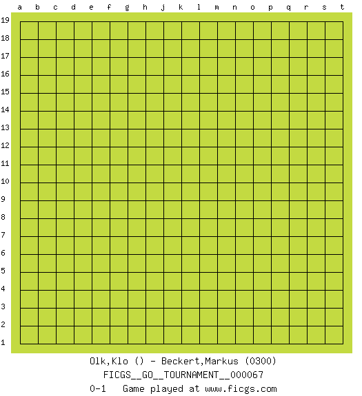 Last move : 0-1 2020 July 30 22:2:46 [Event "FICGS__GO__TOURNAMENT__000067"] [Site "FICGS"] [Date "2020.06.30"] [Round "1"] [Black "Olk,Klo"] [White "Beckert,Markus"] [Result "0-1"] [Rating 2 "0300"] 0-1 This go game has been lost on time (started : 2020.06.30 11:22:26) Here are the names of the openings (joseki) played in the four corners : Player White won this Go (weiqi, baduk) game. Follow this game move after move (download)Go uses the most elemental materials and concepts - line and circle, wood and stone, black and white - combining them with simple rules to generate subtle strategies and complex tactics that stagger the imagination. (Iwamoto Kaoru, 9 dan professional Go player and former Honinbo title holder) Optimism is a variety of information deficit. Sometimes especially true for correspondence chess games. (Michael Aigner)