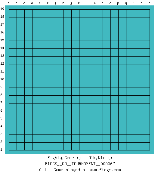 Last move : 0-1 2020 July 30 22:2:46 [Event "FICGS__GO__TOURNAMENT__000067"] [Site "FICGS"] [Date "2020.06.30"] [Round "1"] [Black "Eighty,Gene"] [White "Olk,Klo"] [Result "0-1"] 0-1 This go game has been lost on time (started : 2020.06.30 11:22:26) Here are the names of the openings (joseki) played in the four corners : Player White won this Go (weiqi, baduk) game. Follow this game move after move (download)Keshi is worth as much as an invasion ! (Anonymous) Inventor: A person who makes an ingenious arrangement of wheels, levers and springs, and believes it civilization. (Ambrose Bierce, The Devil's Dictionary)