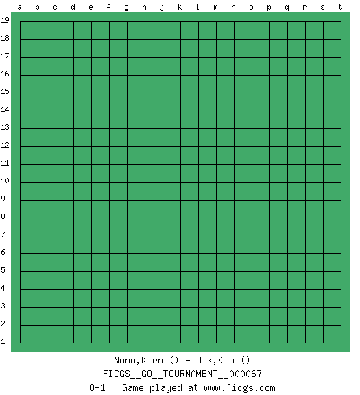 Last move : 0-1 2020 July 30 22:2:46 [Event "FICGS__GO__TOURNAMENT__000067"] [Site "FICGS"] [Date "2020.06.30"] [Round "1"] [Black "Nunu,Kien"] [White "Olk,Klo"] [Result "0-1"] 0-1 This go game has been lost on time (started : 2020.06.30 11:22:26) Here are the names of the openings (joseki) played in the four corners : Player White won this Go (weiqi, baduk) game. Follow this game move after move (download)If you don't know ladders, don't play go. (Anonymous) Are you threatening me, Master Jedi ? (Chancellor Palpatine in Star Wars ep.3)