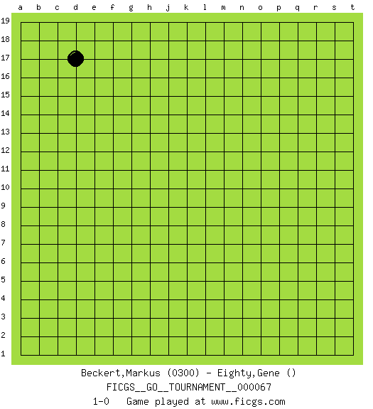 Last move : 1-0 2020 July 30 22:2:46 [Event "FICGS__GO__TOURNAMENT__000067"] [Site "FICGS"] [Date "2020.06.30"] [Round "1"] [Black "Beckert,Markus"] [White "Eighty,Gene"] [Result "1-0"] [Rating 1 "0300"] 1.d17 1-0 This go game has been lost on time (started : 2020.06.30 11:22:26) Here are the names of the openings (joseki) played in the four corners : Player Black won this Go (weiqi, baduk) game. Follow this game move after move (download)Territory is a closed space where time no longer exists. The transformation around it slower alter it, and sometimes it cracks open like a rotten egg at the least shock. (Pierre Audouard) He who is a good ruler must first have been ruled. (Aristotle)