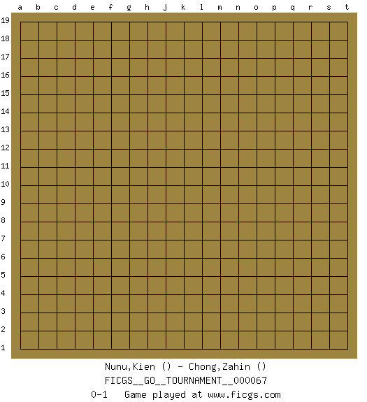 Last move : 0-1 2020 July 30 22:2:46 [Event "FICGS__GO__TOURNAMENT__000067"] [Site "FICGS"] [Date "2020.06.30"] [Round "1"] [Black "Nunu,Kien"] [White "Chong,Zahin"] [Result "0-1"] 0-1 This go game has been lost on time (started : 2020.06.30 11:22:26) Here are the names of the openings (joseki) played in the four corners : Player White won this Go (weiqi, baduk) game. Follow this game move after move (download)A basic: Don't push too hard. (Jansteen) Wawaweewa ! (Borat: Cultural learnings of America for make benefit glorious nation of Kazakhstan)