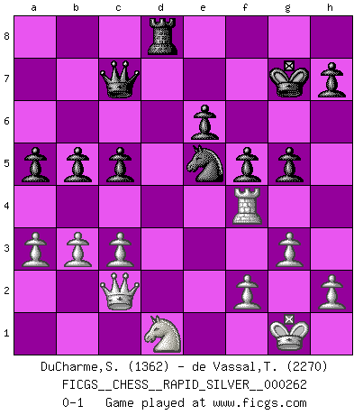 Last move : 0-1 2020 August 1 21:57:28 [Event "FICGS__CHESS__RAPID_SILVER__000262"] [Site "FICGS"] [Date "2020.06.30"] [Round "1"] [White "DuCharme,Steven"] [Black "de Vassal,Thibault"] [Result "0-1"] [WhiteElo "1362"] [BlackElo "2270"] 1.Nf3 Nf6 2.g3 d5 3.Bg2 g6 4.O-O c5 5.b3 Bg7 6.Bb2 O-O 7.d3 Nc6 8.Nbd2 Qc7 9.a3 a5 10.e4 dxe4 11.dxe4 Rd8 12.Re1 Nxe4 13.Bxg7 Nxd2 14.Nxd2 Kxg7 15.c3 Rd3 16.Qc2 Bf5 17.Be4 Bxe4 18.Rxe4 Rad8 19.Nc4 b5 20.Ne3 f5 21.Rh4 Ne5 22.Rf4 e6 23.Rd1 Rxd1+ 24.Nxd1 g5 0-1 Reti Opening Kingside Castling by player White (move 4) Kingside Castling by player Black (move 6) Player Black won this chess game. Follow this game move after move (download)All I want to do, ever, is just play Chess. (Bobby Fischer) Fischer ist das größte Genie, das je vom Schachhimmel heruntergestiegen ist. (Mikhail Nekhemyevich Tal) El Ajedrez es una manera fabulosa para que los niños aprendan a autovalorarse y a autoestimarse. (Saudin Robovic) En blitz, le Cavalier l'emporte sur le Fou. (Vlastimil Hort) CHESS, n. f. [echecs, Fr.] A nice and abstruse game, in which two sets of puppets are moved in opposition to each other. (Dr Samuel Johnson, A Dictionary Of The English Language, 1755)