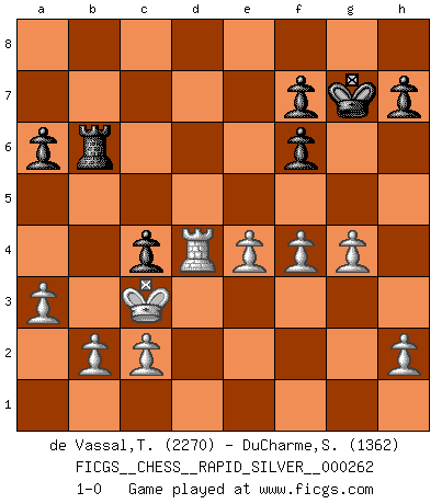 Last move : 1-0 2020 August 5 18:11:32 [Event "FICGS__CHESS__RAPID_SILVER__000262"] [Site "FICGS"] [Date "2020.06.30"] [Round "2"] [White "de Vassal,Thibault"] [Black "DuCharme,Steven"] [Result "1-0"] [WhiteElo "2270"] [BlackElo "1362"] 1.e4 c5 2.Nf3 Nc6 3.d4 cxd4 4.Nxd4 Nf6 5.Nc3 e6 6.Ndb5 d6 7.Bf4 e5 8.Bg5 Be7 9.Bxf6 gxf6 10.Nd5 O-O 11.Nxe7+ Qxe7 12.Qxd6 Qxd6 13.Nxd6 Be6 14.O-O-O Rab8 15.a3 Rfd8 16.g4 Nd4 17.Nf5 Nf3 18.Be2 Nd4 19.Nxd4 exd4 20.Rd2 a6 21.Rhd1 b5 22.Rxd4 Rxd4 23.Rxd4 Rb6 24.Kd2 Kg7 25.f4 Bc4 26.Bxc4 bxc4 27.Kc3 1-0 Sicilian defense Kingside Castling by player Black (move 10) Queenside Castling by player White (move 14) Player White won this chess game. Follow this game move after move (download)The laws of Chess do not permit a free choice: you have to move whether you like it or not. (Emanuel Lasker) Die Fehler sind da, Sie warten nur darauf gemacht zu werden. (Savielly Grigorievitsch Tartakower) Hay dos clases de hombres: aquellos que se conforman en dejarse llevar por las circunstancias y que juegan barajas y aquellos decididos a controlar las circunstancias y que juegan al Ajedrez. (Mortimer Collins) Soyez une menace à chaque fois que vous vous asseyez pour jouer. (Ken Smith) I don't believe in psychology. I believe in good moves. (Bobby Fischer)