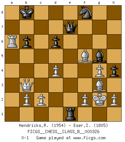 Last move : 0-1 2021 April 1 16:0:27 [Event "FICGS__CHESS__CLASS_B__000326"] [Site "FICGS"] [Date "2020.06.30"] [Round "1"] [White "Hendricks,Richard"] [Black "Eser,Ipekyilmaz"] [Result "0-1"] [WhiteElo "1954"] [BlackElo "1805"] 1.d4 f6 2.e4 b6 3.Nf3 Bb7 4.Bd3 e6 5.O-O d6 6.Re1 Nd7 7.Nc3 Be7 8.Bd2 Nf8 9.a4 h6 10.Nh4 f5 11.exf5 Bxh4 12.a5 a6 13.Qh5+ Kd7 14.fxe6+ Kc8 15.e7 Bxe7 16.axb6 cxb6 17.Qf7 Kb8 18.Qxg7 Bf6 19.Qf7 Bc6 20.Bf4 Ra7 21.Qb3 Ne7 22.Bxa6 Nf5 23.Nb5 Bxb5 24.Bxb5 R8h7 25.Bd3 Rhe7 26.Bxf5 Ra5 27.g4 Bg5 28.Bg3 h5 29.Rxa5 Rxe1+ 30.Kg2 h4 31.Ra6 Qe7 0-1 Follow this game move after move (download)The combination player thinks forward; he starts from the given position, and tries the forceful moves in his mind. (Emanuel Lasker) Der Bart als Geschlechtszeichen mitten im Gesicht ist obszön. Daher gefällt er den Weibern. [Zugegeben, kein Schachzitat, aber unglaublich originell] (Arthur Schopenhauer) El Ajedrez es una hermosa aventura. (Bent Larsen) Tous ces prétendus hommes politiques sont les pions, les Cavaliers, les Tours ou les Fous d'une partie d'échecs qui se jouera tant qu'un hasard ne renversera pas l'échiquier. (Honoré de Balzac) Never risk one's whole fortune unless supported by one's entire army. (Niccolo Machiavelli)