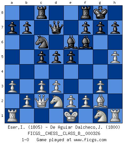 Last move : 1-0 2020 October 19 21:21:54 [Event "FICGS__CHESS__CLASS_B__000326"] [Site "FICGS"] [Date "2020.06.30"] [Round "1"] [White "Eser,Ipekyilmaz"] [Black "De Aguiar Dalcheco,Julio Cesar"] [Result "1-0"] [WhiteElo "1805"] [BlackElo "1800"] 1.a3 d5 2.g3 c5 3.Bg2 Nf6 4.d3 Nc6 5.c3 e5 6.Qc2 Be6 7.Bg5 Be7 8.Bxf6 Bxf6 9.Nd2 O-O 10.h3 Qd7 11.h4 Rac8 12.h5 1-0 This chess game has been lost on time (started : 2020.06.30 16:43:13) Anderssen's Opening Kingside Castling by player Black (move 9) Player White won this chess game. Follow this game move after move (download)A player surprised is half beaten. (Proverb) Ich bin stolz ein Bulgare zu sein. (Veselin Topalov) El Ajedrez por encima de todo... ¡es una pelea!. (Emanuel Lasker) Roi des jeux et jeu des rois, les échecs portent en eux un sentiment d'infini. Ils donnent à celui qui s'est efforcé d'en approfondir les arcanes l'impression de n'être pas à la mesure de l'homme; en fait, ils constituent un résumé de l'univers, un microcosme, et figurent cette grande échelle qui, dans les plans de la lumière descend jusqu'à la matière, qui des abîmes insondables remonte jusqu'en l'infini de Dieu. (Pyrame) Perfection is achieved, not when there is nothing more to add, but when there is nothing left to take away. (Antoine de Saint-Exupéry)