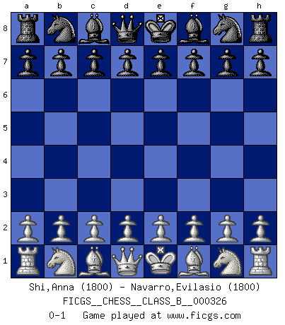 Last move : 0-1 2020 August 9 20:13:1 [Event "FICGS__CHESS__CLASS_B__000326"] [Site "FICGS"] [Date "2020.06.30"] [Round "1"] [White "Shi,Anna"] [Black "Navarro,Evilasio"] [Result "0-1"] [WhiteElo "1800"] [BlackElo "1800"] 0-1 This chess game has been lost on time (started : 2020.06.30 16:43:13) Player Black won this chess game. Follow this game move after move (download)Of all my Russian books, the defense contains and diffuses the greatest 'warmth' which may seem odd seeing how supremely abstract Chess is supposed to be. (Vladimir Nabokov) Ein Schachspiel besteht aus drei Phasen: Die erste, wenn du hofftst den Vorteil zu haben, die zweite, wenn du glaubst einen Vorteil zu haben, und die dritte.... wenn du weißt Du wirst verlieren. (Savielly Grigorievitsch Tartakower) Solo puedes ser bueno en el Ajedrez si amas al juego. (Bobby Fischer) La conception d'un plan est le processus par lequel un joueur exploite les avantages de sa position tout en s'efforçant d'en réduire au minimum les inconvénients. Afin de garantir le succès, un plan doit toujours se fonder sur un diagnostic objectif des particularités d'une position. La conception d'un plan est d'autant plus difficile que la position est équilibrée, et grandement facilitée lorsqu'il n'existe qu'un seul plan susceptible de répondre aux exigences de la position. (Harry Golombek) There are 10 types of people in this world: those who understand binary and those who don't. (Anonymous)