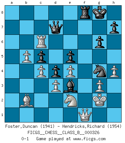 Last move : 0-1 2020 October 16 16:25:36 [Event "FICGS__CHESS__CLASS_B__000326"] [Site "FICGS"] [Date "2020.06.30"] [Round "1"] [White "Foster,Duncan"] [Black "Hendricks,Richard"] [Result "0-1"] [WhiteElo "1941"] [BlackElo "1954"] 1.e4 c5 2.a3 g6 3.b4 Bg7 4.Nc3 d6 5.g3 b6 6.Bg2 Bb7 7.Nge2 e6 8.O-O Ne7 9.Rb1 O-O 10.d3 Nbc6 11.b5 Ne5 12.f4 Nd7 13.Bb2 d5 14.Qd2 d4 15.Nd1 a6 16.a4 f6 17.c3 axb5 18.axb5 e5 19.fxe5 fxe5 20.Rxf8+ Qxf8 21.Nf2 Nc8 22.Rf1 Qe7 23.h4 Nd6 24.c4 Nf7 25.Bh3 Nf6 26.Kg2 Bh6 27.Qd1 Be3 28.Ng4 Nxg4 29.Bxg4 Nh6 30.Bh3 Qe8 31.Rf6 Bc8 32.Bxc8 Qxc8 33.Qf1 Ng4 34.Rxb6 Qd7 35.Rc6 Rf8 0-1 Sicilian defense Kingside Castling by player White (move 8) Kingside Castling by player Black (move 9) Player Black won this chess game. Follow this game move after move (download)The tactician must know what to do whenever something needs doing; the strategist must know what to do when nothing needs doing. (Savielly Tartakover) Was ist der Unterschied zwischen einem Strassenarbeiter und einem Schachspieler? --Der Schachspieler bewegt sich ab und zu. (Anonymous) El Jaque al descubierto es el bombardero del tablero. (Reuben Fine) Soyez une menace à chaque fois que vous vous asseyez pour jouer. (Ken Smith) Live, lose, and learn, by observing your opponent how to win. (Amber Steenbock)