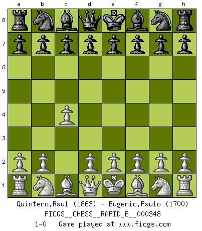 Last move : 1-0 2020 July 31 22:13:3 [Event "FICGS__CHESS__RAPID_B__000348"] [Site "FICGS"] [Date "2020.07.01"] [Round "1"] [White "Quintero,Raul"] [Black "Eugenio,Paulo"] [Result "1-0"] [WhiteElo "1863"] [BlackElo "1700"] 1.c4 1-0 This chess game has been lost on time (started : 2020.07.01 0:59:13) English Opening Player White won this chess game. Follow this game move after move (download)It's always better to sacrifice your opponent's men. (Savielly Tartakover) Das Schach hält seine Meister in eigenen Banden, Fesseln; auf vielerlei Weise formt es ihren Geist, so dass die innere Freiheit selbst des Stärksten beeinflusst wird. (Albert Einstein) El Ajedrez es tortura mental. (Garry Kasparov) C'est une question de caractère, Beaucoup de gens perdent leur motivation très vite. D'autres, ils sont rares, peuvent la conserver très longtemps. J'aime les échecs, encore aujourd'hui je suis heureux d'analyser des parties. J'aime toujours gagner, je déteste encore perdre. Bien jouer est important pour mon intégrité intellectuelle et morale. Et puis les échecs vivent en ce moment une période historique grâce à Internet. Ils se développent dans les systèmes éducatifs à travers le monde. Ils sortent de leur ghetto, et c'est mon rôle de mener à bien cette révolution. (Gary Kasparov) The human is the only animal species whose members are able to talk themselves into difficulties that would not otherwise exist. (Wendell Johnson)
