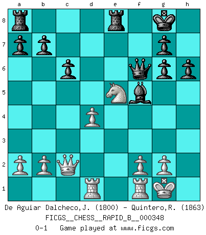 Last move : 0-1 2020 September 1 14:24:21 [Event "FICGS__CHESS__RAPID_B__000348"] [Site "FICGS"] [Date "2020.07.01"] [Round "1"] [White "De Aguiar Dalcheco,Julio Cesar"] [Black "Quintero,Raul"] [Result "0-1"] [WhiteElo "1800"] [BlackElo "1863"] 1.d4 d5 2.c4 e6 3.Nc3 Nf6 4.Nf3 Be7 5.Bg5 O-O 6.e3 h6 7.Bxf6 Bxf6 8.Bd3 c6 9.O-O Nd7 10.cxd5 exd5 11.Qc2 Re8 12.Rad1 Nf8 13.e4 dxe4 14.Nxe4 Bg4 15.Nxf6+ Qxf6 16.Be2 Ng6 17.h3 Bd7 18.Bd3 Bxh3 19.Bxg6 fxg6 20.Ne5 Bf5 0-1 This chess game has been lost on time (started : 2020.07.01 0:59:13) QGD : 4.Nf3 Kingside Castling by player Black (move 5) Kingside Castling by player White (move 9) Player Black won this chess game. Follow this game move after move (download)Not all artists are Chess players, but all Chess players are artists. (Marcel Duchamp) Lisa Lane, amerikanische Schachmeisterin, hatte Fischer einmal als stärksten lebenden Spieler bezeichnet. Antwort: Das ist richtig, aber Lisa Lane ist eigentlich nicht in der Lage, das zu beurteilen. (Robert James Fischer) Un entendimiento a fondo de las continuaciones típicas del mate, hace de las combinaciones de sacrificio mas complicadas conducirlas a ellas no solo sin dificultad, sino casi de una manera natural. (Siegbert Tarrasch) Aidez vos pièces, elles vous aideront. (Paul Morphy) There's always a bigger fish. (Qui-Gon Jinn in Star Wars ep.1)