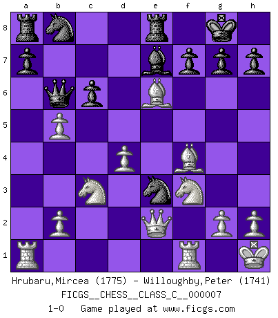 Last move : 1-0 2006 July 12 20:53:10 [Event "FICGS__CHESS__CLASS_C__000007"] [Site "FICGS"] [Date "2006.06.21"] [Round "1"] [White "Hrubaru,Mircea"] [Black "Willoughby,Peter"] [Result "1-0"] [WhiteElo "1775"] [BlackElo "1741"] 1.e4 e5 2.f4 exf4 3.Nf3 d5 4.exd5 Nf6 5.Bc4 Nxd5 6.O-O Be6 7.Bb3 Be7 8.c4 Nb6 9.d4 Nxc4 10.Bxf4 O-O 11.Qe2 b5 12.Nc3 c6 13.a4 Qb6 14.Kh1 Re8 15.axb5 Ne3 16.Bxe6 1-0 KGA : Abbazia defense, Modern variation Kingside Castling by player White (move 6) Kingside Castling by player Black (move 10) Player White won this chess game. Follow this game move after move (download)Fischer sacrificed virtually everything most of us weakies (to use his term) value, respect, and cherish, for the sake of an artful, often beautiful board game, for the ambivalent privilege of being its greatest master. (Paul Kollar) Der Bart als Geschlechtszeichen mitten im Gesicht ist obszön. Daher gefällt er den Weibern. [Zugegeben, kein Schachzitat, aber unglaublich originell] (Arthur Schopenhauer) Cuando tu no sabes absolutamente que mas hacer, es tiempo de entrar en pánico. (John van der Wiel) La vie est comme un jeu d'échecs : nous esquissons un plan, mais celui-ci est tributaire de ce que daignent faire l'adversaire aux échecs et le destin dans la vie. (Arthur Schopenhauer) A belief is an idea the mind possesses, an idea that possesses the mind. (Robert Oxden Bolton)