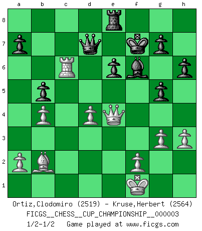 Last move : 1/2-1/2 2020 September 2 18:18:18 [Event "FICGS__CHESS__CUP_CHAMPIONSHIP__000003"] [Site "FICGS"] [Date "2020.07.01"] [Round "1"] [White "Ortiz,Clodomiro"] [Black "Kruse,Herbert"] [Result "1/2-1/2"] [WhiteElo "2519"] [BlackElo "2564"] 1.d4 Nf6 2.c4 c6 3.Nc3 d5 4.e3 e6 5.Nf3 Nbd7 6.Qc2 Be7 7.b3 b6 8.Bd3 h6 9.Bb2 Bb7 10.O-O O-O 11.Rad1 Qc7 12.Qe2 Rad8 13.Bb1 Rfe8 14.cxd5 Nxd5 15.Ne4 N5f6 16.Nxf6+ Bxf6 17.Nd2 c5 18.Ne4 Bxe4 19.Bxe4 cxd4 20.exd4 Nf8 21.g3 Ng6 22.Rc1 Qb8 23.Bxg6 fxg6 24.Qe4 g5 25.Rc6 Rd6 26.Rfc1 Rxc6 27.Rxc6 Qb7 28.h3 Qd7 29.Kf1 Kf7 30.b4 b5 31.Qf3 Kg8 32.Qe4 Kf7 33.Qf3 Kg8 34.Qe4 Kf7 1/2-1/2 Queen's pawn game Kingside Castling by player White (move 10) Kingside Castling by player Black (move 10) This chess game ended in a draw. Follow this game move after move (download)Excellence at Chess is one mark of a scheming mind. (Sir Arthur Conan Doyle) Es gibt Leute, die glauben, alles wäre vernünftig, was man mit einem ernsthaften Gesicht tut. (Georg Christoph Lichtenberg) Coloca el contenido del tablero de Ajedrez en un sombrero, agita las piezas vigorosamente, derrámalas en el tablero desde una altura de medio metro y así obtienes el estilo de Wilhelm Steinitz. (H. E. Bird) Les échecs sont utiles à l'exercice de la faculté de penser et à celle de l'imagination. Car nous devons posséder une méthode élaborée pour atteindre des buts partout où nous devons conduire notre raison. (Leibnitz) There are more things in heaven and earth than practically anywhere else. (Unknown)