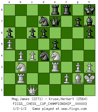 Last move : 1/2-1/2 2020 September 3 17:32:7 [Event "FICGS__CHESS__CUP_CHAMPIONSHIP__000003"] [Site "FICGS"] [Date "2020.07.01"] [Round "1"] [White "Mag,James"] [Black "Kruse,Herbert"] [Result "1/2-1/2"] [WhiteElo "2271"] [BlackElo "2564"] 1.e4 e5 2.Nf3 Nc6 3.Bb5 Nf6 4.d3 Bc5 5.c3 O-O 6.O-O d6 7.Re1 Ng4 8.Re2 Bb6 9.d4 Nf6 10.h3 Bd7 11.a4 a6 12.Bc4 Re8 13.d5 Ne7 14.a5 Ba7 15.Be3 Bxe3 16.Rxe3 Kh8 17.Nbd2 Rg8 18.Nh2 Rf8 19.Bf1 Nfg8 20.c4 Rb8 21.Nhf3 Ng6 22.b4 Nf4 23.Kh2 f5 24.exf5 Bxf5 25.Ne4 h6 26.g3 Ng6 27.Ra2 N6e7 28.Rb2 Bh7 29.Bg2 Nf5 30.Rc3 Nf6 31.Nfd2 Nd7 32.Nb3 Qe7 33.Qd2 Rbe8 34.Qc1 Nd4 35.Re3 c6 36.dxc6 bxc6 1/2-1/2 Ruy Lopez : Berlin defense Kingside Castling by player Black (move 5) Kingside Castling by player White (move 6) This chess game ended in a draw. Follow this game move after move (download)We cannot resist the fascination of sacrifice, since a passion for sacrifices is part of a Chessplayer's nature. (Rudolf Spielman) Das Schach hält seine Meister in eigenen Banden, Fesseln; auf vielerlei Weise formt es ihren Geist, so dass die innere Freiheit selbst des Stärksten beeinflusst wird. (Albert Einstein) Si pudieramos observar el interior de la cabeza de un jugador de Ajedrez, encontraríamos ahí un mundo lleno de sentimientos, imágenes, ideas, emoción y pasión. (Alfred Binet) Le pion, dans sa simplicité, marche droit devant lui, mais lorsqu'il prend, il le fait obliquement? Ainsi l'homme, tant qu'il reste pauvre, marche dans la droiture et vit honnêtement, mais lorsqu'il recherche les honneurs, il flatte, se parjure et, par les voies obliques, cherche une position supérieure sur l'échiquier du monde. (Jean de Galles) The only thing that matters is the evidence. (Horatio Caine, C.S.I. Miami)