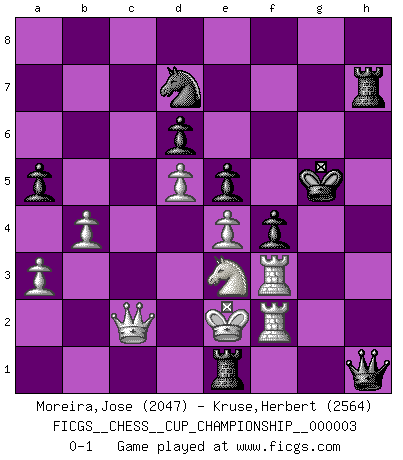Last move : 0-1 2020 September 14 22:28:46 [Event "FICGS__CHESS__CUP_CHAMPIONSHIP__000003"] [Site "FICGS"] [Date "2020.07.01"] [Round "1"] [White "Moreira,Jose"] [Black "Kruse,Herbert"] [Result "0-1"] [WhiteElo "2047"] [BlackElo "2564"] 1.e4 e5 2.Nf3 Nc6 3.Bc4 Nf6 4.d3 Bc5 5.O-O d6 6.c3 O-O 7.Bb3 h6 8.h3 a5 9.Re1 Be6 10.Ba4 Ba7 11.d4 Bd7 12.Be3 Re8 13.d5 Ne7 14.Bxa7 Rxa7 15.c4 Bxa4 16.Qxa4 Ra8 17.Nc3 Rf8 18.Nh4 Nd7 19.Qc2 g6 20.a3 f5 21.Rad1 f4 22.Rc1 Rf7 23.Nf3 g5 24.Qd1 Ng6 25.Nh2 Rh7 26.Na4 h5 27.c5 Nf6 28.Rc3 Rg7 29.f3 Nf8 30.Qb3 g4 31.hxg4 hxg4 32.fxg4 Nxg4 33.Nxg4 Rxg4 34.Qxb7 Qh4 35.Re2 Re8 36.cxd6 cxd6 37.Qb3 Rg3 38.Qc2 Re7 39.Rf2 Nd7 40.Rc8+ Kg7 41.Nc3 Kf6 42.Nd1 Reg7 43.Rc3 Rh7 44.Kf1 Qh1+ 45.Ke2 Rxg2 46.b4 Kg5 47.Rcf3 Rg1 48.Ne3 Re1+ 0-1 Two knights defense (Modern Bishop's Opening) Kingside Castling by player White (move 5) Kingside Castling by player Black (move 6) Player Black won this chess game. Follow this game move after move (download)Chess makes man wiser and clear-sighted. (Vladimir Putin) Bobby Fischer ist kein Vorbild für die heutige Jugend. (Viktor Kortschnoi) Fischer es una tragedia del Ajedrez Americano a la par con Morphy y Pillsbury. (Mig Greengard) Si rien de grave n'est détecté lors de l'analyse d'une position, on joue alors le coup. Seconde règle de Blumenfeld. Unless I accept my faults I will most certainly doubt my virtues. (Hugh Prather)