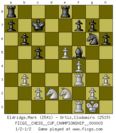 Last move : 1/2-1/2 2020 September 6 22:20:31 [Event "FICGS__CHESS__CUP_CHAMPIONSHIP__000003"] [Site "FICGS"] [Date "2020.07.01"] [Round "1"] [White "Eldridge,Mark"] [Black "Ortiz,Clodomiro"] [Result "1/2-1/2"] [WhiteElo "2541"] [BlackElo "2519"] 1.e4 e5 2.Nf3 Nc6 3.Bb5 Nf6 4.O-O Nxe4 5.d4 Nd6 6.Bxc6 dxc6 7.dxe5 Nf5 8.Qxd8+ Kxd8 9.Nc3 Bd7 10.h3 h6 11.b3 Kc8 12.Bb2 Ne7 13.Rad1 b6 14.Rd2 c5 15.Ne2 Ng6 16.Ne1 c4 17.f4 Bc5+ 18.Bd4 Bxd4+ 19.Rxd4 cxb3 20.axb3 Re8 21.Nf3 c5 22.Rd3 Kc7 23.Nd2 Bf5 24.Rdf3 1/2-1/2 Ruy Lopez : Berlin defense, Open variation Kingside Castling by player White (move 4) This chess game ended in a draw. Follow this game move after move (download)Morphy was probably the greatest genius of them all. (Bobby Fischer) Wenn ich gewinne bin ich ein Genie. Wenn nicht, dann bin ich keines. (Robert James Fischer) ¿Se han dado cuenta de que Fischer casi nunca ha tenido piezas malas? El las intercambia y las piezas malas se quedan con sus oponenets. (Yuri Balashov) On croit qu'il y a plus de mauvais joueurs que de bons joueurs, c'est faux : Il y a autant de joueurs qui gagnent que de joueurs qui perdent. (Philippe Geluck) When you stop learning you start dying. (Scott Adams)