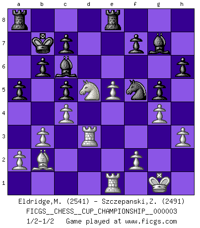 Last move : 1/2-1/2 2020 September 5 21:13:27 [Event "FICGS__CHESS__CUP_CHAMPIONSHIP__000003"] [Site "FICGS"] [Date "2020.07.01"] [Round "1"] [White "Eldridge,Mark"] [Black "Szczepanski,Zbigniew"] [Result "1/2-1/2"] [WhiteElo "2541"] [BlackElo "2491"] 1.e4 e5 2.Nf3 Nc6 3.Bb5 Nf6 4.O-O Nxe4 5.d4 Nd6 6.Bxc6 dxc6 7.dxe5 Nf5 8.Qxd8+ Kxd8 9.Nc3 Bd7 10.Rd1 Kc8 11.Ng5 Be8 12.b3 b6 13.Bb2 h6 14.Nge4 Kb7 15.Rd3 a5 16.h3 g5 17.Re1 c5 18.Nd5 Bg7 19.g4 Nh4 20.Ng3 Bc6 21.c4 Rhe8 22.Nf5 Nxf5 1/2-1/2 Ruy Lopez : Berlin defense, Open variation Kingside Castling by player White (move 4) This chess game ended in a draw. Follow this game move after move (download)All I want to do, ever, is just play Chess. (Bobby Fischer) Sehr viele beherrschen heutzutage das große Einmalseins des Schachspiels und kennen sogar dessen Logarithmentafeln auswendig - deshalb sollte man hin und wieder zu beweisen trachten, dass zwei mal zwei auch fünf sein kann. (Mikhail Nekhemyevich Tal) Ser exitoso en el Ajedrez te permite descubrir tu propia personalidad. Eso es lo que deseo para los niños de mi clase. (Saudin Robovic) On a dit que l'homme se distingue de l'animal par le fait qu'il achète plus de livres qu'il ne peut en lire. Je voudrais suggérer qu'inclure à la liste des livres quelques livres d'échecs rendrait la distinction manifeste. (Edward Lasker) SEO proverb : Make your website optimized for human beings, not for search engines.