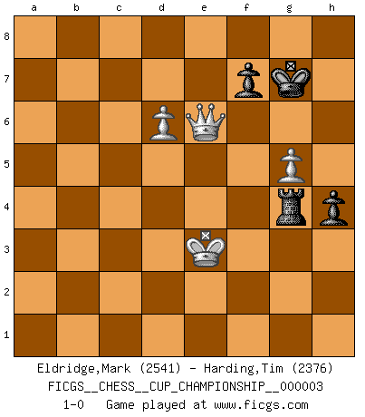Last move : 1-0 2020 October 19 21:46:19 [Event "FICGS__CHESS__CUP_CHAMPIONSHIP__000003"] [Site "FICGS"] [Date "2020.07.01"] [Round "1"] [White "Eldridge,Mark"] [Black "Harding,Tim"] [Result "1-0"] [WhiteElo "2541"] [BlackElo "2376"] 1.Nf3 d5 2.d4 Nf6 3.c4 c6 4.Nc3 e6 5.Bg5 dxc4 6.e4 b5 7.e5 h6 8.Bh4 g5 9.Bg3 Nh5 10.a4 a6 11.Be2 Ng7 12.O-O Bb7 13.b3 cxb3 14.Qxb3 Nd7 15.Rfc1 g4 16.Ne1 Nf5 17.Rd1 Qb6 18.Nc2 h5 19.Bf4 Be7 20.Rab1 b4 21.Ne4 c5 22.Nd6+ Bxd6 23.exd6 O-O 24.dxc5 Qc6 25.Bf1 a5 26.Ne3 Qe4 27.Nxf5 Qxf5 28.Bh6 Rfc8 29.Qb2 e5 30.Be3 Nxc5 31.Bxc5 Rxc5 32.Rbc1 Rd5 33.Rxd5 Bxd5 34.Rc5 Be6 35.Rxe5 Qf6 36.Qd4 b3 37.h4 gxh3 38.f4 Rb8 39.Rg5+ Qxg5 40.fxg5 b2 41.Bd3 b1Q+ 42.Bxb1 Rxb1+ 43.Kh2 hxg2 44.Kxg2 Rb4 45.Qd1 Bd7 46.Qd5 Rxa4 47.Kf2 Rg4 48.Qxa5 Be6 49.Qd8+ Kg7 50.Qf6+ Kg8 51.Qe7 Kg7 52.Ke3 h4 53.Qxe6 1-0 Reti Opening Kingside Castling by player White (move 12) Kingside Castling by player Black (move 23) Promotion Queen by player Black (move 41) 10 pieces endgame at move 46 : White KQPP , Black KRBPPP WHITE : King + 1 Queen 2 Pawns BLACK : King + 1 Rook 1 Bishop 3 Pawns 9 pieces endgame at move 48 : White KQPP , Black KRBPP WHITE : King + 1 Queen 2 Pawns BLACK : King + 1 Rook 1 Bishop 2 Pawns 8 pieces endgame at move 53 : White KQPP , Black KRPP WHITE : King + 1 Queen 2 Pawns BLACK : King + 1 Rook 2 Pawns Player White won this chess game. Follow this game move after move (download)In Chess, as it is played by masters, chance is practically eliminated. (Emanuel Lasker) Mein Gehirn das ist mein zweitwichtigstes Organ [Aus dem Film: Der Schläfer]. (Woody Allen) Una victoria por una combinación errónea, aunque sea espectacular, me llena de horror artístico. (Wilhelm Steinitz) Aux échecs, l'amour-propre est satisfait quand on remporte la victoire, mais il n'y a pas de honte à être battu. (Benjamin Franklin) All the troubles of the world come from being unable to sit alone in a quiet room. (Blaise Pascal)