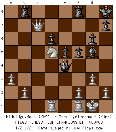 Last move : 1/2-1/2 2020 September 7 8:17:18 [Event "FICGS__CHESS__CUP_CHAMPIONSHIP__000003"] [Site "FICGS"] [Date "2020.07.01"] [Round "1"] [White "Eldridge,Mark"] [Black "Marciz,Alexander"] [Result "1/2-1/2"] [WhiteElo "2541"] [BlackElo "2365"] 1.Nf3 c5 2.e4 Nc6 3.d4 cxd4 4.Nxd4 Nf6 5.Nc3 e5 6.Ndb5 d6 7.Bg5 a6 8.Na3 b5 9.Nd5 Be7 10.Bxf6 Bxf6 11.c3 Rb8 12.Nc2 Bg5 13.a3 Ne7 14.Nxe7 Bxe7 15.Nb4 Bb7 16.Nd5 Bg5 17.g3 O-O 18.Bh3 g6 19.Qd3 Qe8 20.O-O Rd8 21.Rad1 Kh8 22.c4 bxc4 23.Qxc4 Qc6 24.Qd3 a5 25.Rfe1 Ba6 26.Qf3 Qc2 27.Bf1 Bxf1 28.Rxf1 f5 29.Qc3 Qxe4 30.Qxa5 Rb8 31.Qc7 1/2-1/2 Reti Opening Kingside Castling by player Black (move 17) Kingside Castling by player White (move 20) This chess game ended in a draw. Follow this game move after move (download)The passed pawn is a criminal, who should be kept under lock and key. Mild measures, such as police surveillance, are not sufficient. (Nimzovitch) Ich verstehe den Grund nicht, warum die Aufteilung in Frauen und Männer überhaupt im Schach besteht. (Judith Polgar) Cuando no sepas que mover, espera por una idea que se le venga a la la cabeza de tu oponente. Tenlo por seguro de que esa idea estará incorrecta. (Siegbert Tarrasch) Mon pion favori sur ma case favorite ! Bronstein en parlant d'un coup de pion en h5 quand il avait les Noirs. Creativity is allowing yourself to make mistakes. Art is knowing which ones to keep. (Scott Adams)