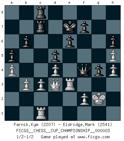 Last move : 1/2-1/2 2020 October 1 21:21:39 [Event "FICGS__CHESS__CUP_CHAMPIONSHIP__000003"] [Site "FICGS"] [Date "2020.07.01"] [Round "1"] [White "Farnik,Kym"] [Black "Eldridge,Mark"] [Result "1/2-1/2"] [WhiteElo "2207"] [BlackElo "2541"] 1.d4 d5 2.Bf4 Nf6 3.Nf3 c5 4.e3 Nc6 5.Be2 cxd4 6.exd4 Bf5 7.O-O e6 8.Nbd2 Qb6 9.Nb3 a5 10.a4 Be7 11.Ne5 h6 12.Bd3 Bxd3 13.Nxd3 Bd8 14.c3 Bc7 15.Bxc7 Qxc7 16.Nd2 O-O 17.Re1 Ne7 18.Nf3 Nf5 19.Nfe5 Nd7 20.Nxd7 Qxd7 21.Qb3 Rfb8 22.Qc2 Nd6 23.Ne5 Qe7 24.Nd3 b6 25.b3 Rb7 26.Qb2 Nf5 27.g3 Rc7 28.h4 Rac8 29.Rac1 g5 30.h5 g4 31.Qd2 Qg5 32.Nf4 Qf6 33.Re5 Rc6 34.Kg2 Kg7 35.Qd3 Nh4+ 36.gxh4 Qxf4 37.Re3 Kg8 38.Rc2 Kg7 39.Rc1 Kg8 40.Rc2 R6c7 41.Rc1 Kf8 42.Rc2 Ke7 43.Rc1 1/2-1/2 Queen's pawn, Mason variation Kingside Castling by player White (move 7) Kingside Castling by player Black (move 16) This chess game ended in a draw. Follow this game move after move (download)Adequate compensation for a sacrifice is having a sound combination leading to a winning position; adequate compensation for a blunder is having your opponent snatch defeat from the jaws of victory. (Bruce A. Moon) Über die Verhaftung Bobby Fischers: Warum es die Bush-Administration für nötig befindet einen 61 Jahre alten Mann zu hetzten, der für niemanden ausser sich selbste eine Gefahr darstellt ist ein Rätsel. (Nigel Short) El Ajedrez es un invernadero donde los frutos del carácter pueden madurar mas completamente que en la vida. (Edward Morgan Foster) Dieu déplace le joueur, et celui-ci la pièce. Quel Dieu derrière Dieu commence donc la trame ? Arturo Perez-Reverte (prix de littérature policière 1993). All battles are fought by scared men who'd rather be someplace else. (John Wayne in the movie In harm's way)