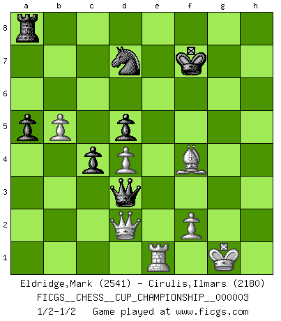 Last move : 1/2-1/2 2020 September 9 23:18:23 [Event "FICGS__CHESS__CUP_CHAMPIONSHIP__000003"] [Site "FICGS"] [Date "2020.07.01"] [Round "1"] [White "Eldridge,Mark"] [Black "Cirulis,Ilmars"] [Result "1/2-1/2"] [WhiteElo "2541"] [BlackElo "2180"] 1.Nf3 d5 2.d4 Nf6 3.c4 e6 4.Nc3 c6 5.Bg5 dxc4 6.e4 b5 7.e5 h6 8.Bh4 g5 9.Bg3 Nd5 10.Nd2 Nd7 11.Be2 Bb7 12.a4 Qb6 13.O-O Be7 14.Nde4 a5 15.Rc1 O-O 16.Re1 Nxc3 17.bxc3 c5 18.Nd6 cxd4 19.cxd4 Bxd6 20.exd6 Bd5 21.h4 f5 22.hxg5 f4 23.Bh4 hxg5 24.Bxg5 Qxd6 25.Bh5 f3 26.axb5 Rf5 27.Qd2 fxg2 28.Bg4 Rf7 29.Rc3 Rh7 30.Rh3 Rxh3 31.Bxh3 Kf7 32.Bf4 Qa3 33.Bxg2 Qd3 34.Bxd5 exd5 1/2-1/2 Reti Opening Kingside Castling by player White (move 13) Kingside Castling by player Black (move 15) This chess game ended in a draw. Follow this game move after move (download)Chess problems demand from the composer the same virtues that characterize all worthwhile art: originality, invention, conciseness, harmony, complexity, and splendid insincerity. (Vladimir Nabokov) Der Partner hat auch seine Existenzberechtigung. (Savielly Grigorievitsch Tartakower) Si pudieramos observar el interior de la cabeza de un jugador de Ajedrez, encontraríamos ahí un mundo lleno de sentimientos, imágenes, ideas, emoción y pasión. (Alfred Binet) Ne tendez aucun piège pour le plaisir ! Ne jouez rien dans l'espoir que l'adversaire réagisse de façon stupide ! Prenez toujours pour acquis que l'adversaire va trouver le meilleur coup ! Ne jouez jamais de coup dans l'espoir que l'adversaire ne voie pas la menace ! Chacun de vos coups doit améliorer la position d'une façon ou d'une autre. The beginning is the most important part of the work. (Plato)