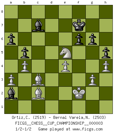 Last move : 1/2-1/2 2020 September 13 17:2:8 [Event "FICGS__CHESS__CUP_CHAMPIONSHIP__000003"] [Site "FICGS"] [Date "2020.07.01"] [Round "1"] [White "Ortiz,Clodomiro"] [Black "Bernal Varela,Nelson"] [Result "1/2-1/2"] [WhiteElo "2519"] [BlackElo "2503"] 1.d4 e6 2.c4 d5 3.e3 Nf6 4.Nf3 Be7 5.Nc3 O-O 6.a3 c5 7.dxc5 dxc4 8.Qc2 Bxc5 9.Bxc4 a6 10.Ne4 Nxe4 11.Qxe4 Nd7 12.b4 Nf6 13.Qc2 Bd6 14.Bb2 Qc7 15.Rc1 b5 16.Be2 Qxc2 17.Rxc2 Bb7 18.O-O Rfc8 19.Rfc1 Rxc2 20.Rxc2 h6 21.Be5 Rd8 22.Bb2 Nd7 23.Nd2 Rc8 24.Rxc8+ Bxc8 25.f4 Bb7 26.Kf2 g6 27.g3 Bc7 28.Bd1 Kf8 29.Ke2 f6 30.h4 h5 31.Bc3 e5 32.Kf2 Kg7 33.Nf3 Bd5 34.Bc2 Kf7 35.e4 Ba2 36.fxe5 Nxe5 37.Nxe5+ 1/2-1/2 Queen's pawn Kingside Castling by player Black (move 5) Kingside Castling by player White (move 18) This chess game ended in a draw. Follow this game move after move (download)An attack on the wing should be met by play in the center. (Nimzovitch) Je mehr wir mit Computern analysieren, desto mehr glauben wir an Verteidigung. (Vladimir Kramnik) Bobby Fischer es el mas grande genio de Ajedrez de todos los tiempos. (Alexander Kotov) Les Echecs sont et restent toujours un combat, un combat intégral comme la boxe, la lutte ou un autre sport, et où il doit y avoir un vainqueur et un vaincu. (Joseph Emil Diemer) He who laughs last probably does not get the joke. (Unknown)