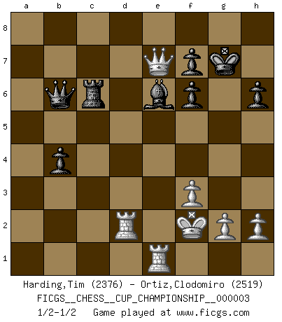 Last move : 1/2-1/2 2020 August 17 16:17:45 [Event "FICGS__CHESS__CUP_CHAMPIONSHIP__000003"] [Site "FICGS"] [Date "2020.07.01"] [Round "1"] [White "Harding,Tim"] [Black "Ortiz,Clodomiro"] [Result "1/2-1/2"] [WhiteElo "2376"] [BlackElo "2519"] 1.e4 e5 2.Nf3 Nc6 3.d4 exd4 4.Nxd4 Bc5 5.Nb3 Bb6 6.Nc3 Nf6 7.Qe2 O-O 8.Bg5 h6 9.Bh4 a5 10.O-O-O a4 11.Nd2 Bd4 12.Nb5 a3 13.bxa3 d6 14.Nxd4 Nxd4 15.Qe3 c5 16.c3 Be6 17.cxd4 cxd4 18.Qxd4 Rxa3 19.Bxf6 gxf6 20.Nb1 Qc7+ 21.Kd2 Qa5+ 22.Nc3 d5 23.exd5 Rd8 24.Bc4 b5 25.Ke2 Rxc3 26.Bb3 b4 27.f3 Rxb3 28.axb3 Rxd5 29.Qb2 Qb5+ 30.Ke3 Rc5 31.Kf2 Rc3 32.Qd2 Bxb3 33.Qd8+ Kg7 34.Rd2 Be6 35.Re1 Rc6 36.Qe7 Qb6+ 37.Kg3 Qb8+ 38.Kf2 Qb6+ 39.Kg3 Qb8+ 40.Kf2 Qb6+ 1/2-1/2 Scotch : Potter variation Kingside Castling by player Black (move 7) Queenside Castling by player White (move 10) This chess game ended in a draw. Follow this game move after move (download)There are two classes of men; those who are content to yield to circumstances and who play whist; those who aim to control circumstances, and who play Chess. (Mortimer Collins) Ein unbeabsichtigtes Patt ist der Gipfel der Dummheit. (Anonymous) Botvinnik trataba de restarle el misterio al Ajedrez, siempre relacionandolo a situaciones de la vida ordinaria. El gustaba de llamar al Ajedrez un típico problema inexacto similar a aquellos de los cuales la gente siempre tiene que enfrentarse en la vida cotidiana. (Garry Kasparov) Le génie consiste à savoir transgresser les règles au moment opportun. (Teichmann) Perception is reality. (Immanuel Kant)