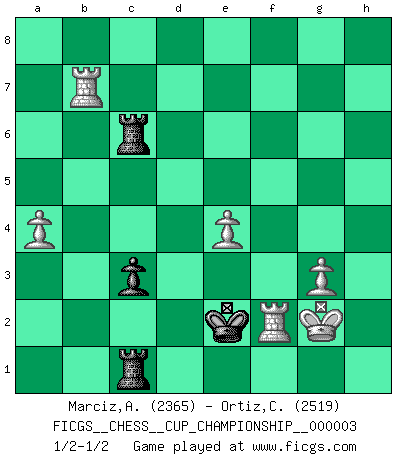 Last move : 1/2-1/2 2020 September 18 20:5:51 [Event "FICGS__CHESS__CUP_CHAMPIONSHIP__000003"] [Site "FICGS"] [Date "2020.07.01"] [Round "1"] [White "Marciz,Alexander"] [Black "Ortiz,Clodomiro"] [Result "1/2-1/2"] [WhiteElo "2365"] [BlackElo "2519"] 1.e4 e5 2.Nf3 Nc6 3.Bb5 Nf6 4.d3 Bc5 5.Ba4 d6 6.c3 O-O 7.O-O Bb6 8.Nbd2 Ne7 9.Nc4 Ng6 10.h3 Be6 11.Nxb6 axb6 12.Re1 h6 13.d4 Qc8 14.Kh2 c5 15.d5 Bd7 16.Bxd7 Qxd7 17.Nd2 b5 18.Nf1 Kh7 19.Ng3 Ng8 20.Qg4 Qxg4 21.hxg4 N6e7 22.Rh1 g6 23.Kg1 f5 24.gxf5 gxf5 25.f3 fxe4 26.fxe4 Rf6 27.Bd2 Rg6 28.Nh5 Rf8 29.Rh3 Rg4 30.Ng3 Rf6 31.Rf1 Kg6 32.Rf2 Kf7 33.b3 Ke8 34.Re2 Rfg6 35.Nh5 Nf6 36.Nxf6+ Rxf6 37.Bxh6 Ng8 38.Bd2 Rf7 39.Rh8 Kd7 40.Rh5 Rfg7 41.Rf5 Ke7 42.Ref2 R4g6 43.Kf1 Nf6 44.Bg5 Rxg5 45.Rxf6 Rg3 46.R6f3 R3g4 47.Re2 Rh4 48.Kf2 Rh1 49.Rb2 Kd8 50.Rc2 Kc7 51.Re2 Rc1 52.Rd2 Kb6 53.g3 Ka5 54.Re2 Rg8 55.Kg2 b4 56.cxb4+ Kxb4 57.a4 Rh8 58.Rf6 Kxb3 59.Rxd6 Kc4 60.Re6 Kd4 61.d6 Rd8 62.Rd2+ Ke3 63.Rf2 c4 64.Rxe5 Rxd6 65.Re7 c3 66.Rf3+ Ke2 67.Rxb7 Rc6 68.Rf2+ Ke3 69.Rf3+ Ke2 70.Rf2+ 1/2-1/2 Ruy Lopez : Berlin defense Kingside Castling by player Black (move 6) Kingside Castling by player White (move 7) 10 pieces endgame at move 67 : White KRRPPP , Black KRRP WHITE : King + 2 Rooks 3 Pawns BLACK : King + 2 Rooks 1 Pawn This chess game ended in a draw. Follow this game move after move (download)It's always better to sacrifice your opponent's men. (Savielly Tartakover) Der Vorposten provoziert a) eine Basis für neue Angriffe und b) eine Schwächung der gegnerischen Widerstandskraft in der fraglichen Linie. (Aaron Nimzowitsch) Los Peones son el alma de una partida de Ajedrez. (Francois Andre Danican Philidor) Il n'y a plus de joueurs du niveau de Jacob Murray dont la seule quête est le beau jeu, le plaisir de voir les pièces construire quelque chose. Sur 10 idées à la minute, 9 seront sans intérêt, la dernière s'avèrera géniale. (Christian Bauer) Fortune favours the audacious. (Desiderius Erasmus)