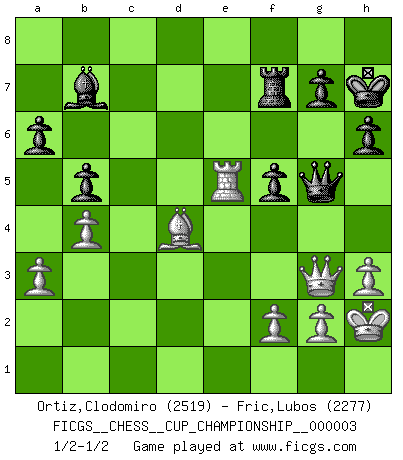 Last move : 1/2-1/2 2020 September 22 18:44:48 [Event "FICGS__CHESS__CUP_CHAMPIONSHIP__000003"] [Site "FICGS"] [Date "2020.07.01"] [Round "1"] [White "Ortiz,Clodomiro"] [Black "Fric,Lubos"] [Result "1/2-1/2"] [WhiteElo "2519"] [BlackElo "2277"] 1.Nf3 Nf6 2.d4 d5 3.c4 c6 4.Nc3 e6 5.e3 Nbd7 6.Qc2 Bd6 7.Bd3 O-O 8.O-O dxc4 9.Bxc4 b5 10.Bd3 Bb7 11.a3 Re8 12.h3 a6 13.Ng5 h6 14.Nge4 Bf8 15.Rd1 Qc7 16.b4 e5 17.Bd2 Nxe4 18.Nxe4 exd4 19.exd4 Rad8 20.Re1 Nb6 21.Rad1 Bc8 22.Re3 Kh8 23.Nc5 Rxe3 24.Bxe3 Nd5 25.Qd2 Qd6 26.Qc2 Qf6 27.Bc1 Re8 28.Ne4 Qe6 29.Bd2 Rd8 30.Re1 Qg6 31.Ng5 Qf6 32.Nh7 Qxd4 33.Nxf8 Rxf8 34.Bc1 Bd7 35.Bb2 Qh4 36.Qc5 Qd8 37.Qd4 f6 38.Qe4 f5 39.Qf3 Kh7 40.Bc2 Qg5 41.Bb3 Rf7 42.Bxd5 cxd5 43.Re5 Bc8 44.Kh2 d4 45.Bxd4 Bb7 46.Qg3 1/2-1/2 Reti Opening Kingside Castling by player Black (move 7) Kingside Castling by player White (move 8) This chess game ended in a draw. Follow this game move after move (download)Chess is so inspiring that I do not believe a good player is capable of having an evil thought during the game. (Wilhelm Steinitz) Matt entspricht nicht immer den Tatsachen. (Savielly Grigorievitsch Tartakower) Una victoria por una combinación errónea, aunque sea espectacular, me llena de horror artístico. (Wilhelm Steinitz) Un millionnaire : 'Monsieur Steinitz ! Vous ne participez aux tournois que pour l'argent, alors que moi je n'y viens que pour l'honneur.' Steinitz : 'Chacun joue pour ce qu'il n'a pas'... Convictions are more dangerous enemies of truth than lies. (Friedrich Nietzsche)