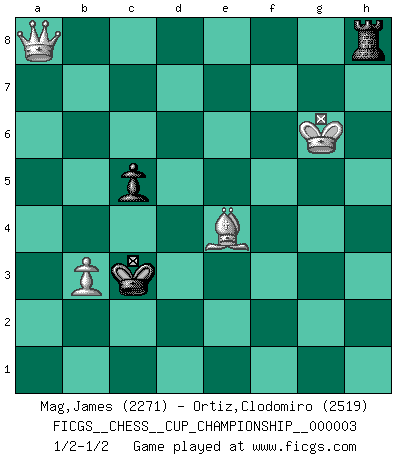 Last move : 1/2-1/2 2020 October 9 21:49:21 [Event "FICGS__CHESS__CUP_CHAMPIONSHIP__000003"] [Site "FICGS"] [Date "2020.07.01"] [Round "1"] [White "Mag,James"] [Black "Ortiz,Clodomiro"] [Result "1/2-1/2"] [WhiteElo "2271"] [BlackElo "2519"] 1.e4 e5 2.Nf3 Nc6 3.Bb5 Nf6 4.d3 d6 5.O-O Be7 6.c3 O-O 7.Nbd2 a6 8.Ba4 Re8 9.Re1 Bf8 10.h3 b5 11.Bc2 Ne7 12.Nf1 Ng6 13.d4 exd4 14.cxd4 c5 15.d5 Nd7 16.Ng3 a5 17.b3 Be7 18.Rb1 b4 19.Nf5 Bf8 20.Bg5 Nf6 21.Ng3 Be7 22.Bc1 Nd7 23.Nf5 Bf8 24.Bg5 Qc7 25.h4 h6 26.h5 Ne7 27.Bxe7 Bxe7 28.e5 Nxe5 29.Rxe5 dxe5 30.d6 Bxd6 31.Qxd6 Ra7 32.Qxc7 Rxc7 33.Nd6 Re6 34.Nxc8 e4 35.Nd2 Rxc8 36.Nc4 Rd8 37.Kf1 f5 38.Rc1 Kf7 39.g3 g5 40.hxg6+ Kxg6 41.Bb1 h5 42.Nxa5 h4 43.gxh4 e3 44.fxe3 Rxe3 45.Nc4 Rc3 46.Rxc3 bxc3 47.Ke2 Kf6 48.a4 Rd4 49.a5 Rxh4 50.Nb6 Rh1 51.Bc2 Ke5 52.a6 Rh7 53.Nc4+ Kd4 54.Na3 Rh2+ 55.Kf3 Rh3+ 56.Kf4 Rh4+ 57.Kxf5 Rh8 58.Nb5+ Ke3 59.Be4 Rh5+ 60.Kg6 Rh8 61.Nxc3 Kd4 62.a7 Kxc3 63.a8Q 1/2-1/2 Ruy Lopez : Berlin defense Kingside Castling by player White (move 5) Kingside Castling by player Black (move 6) 10 pieces endgame at move 49 : White KBNPP , Black KRPPP WHITE : King + 1 Bishop 1 Knight 2 Pawns BLACK : King + 1 Rook 3 Pawns 9 pieces endgame at move 57 : White KBNPP , Black KRPP WHITE : King + 1 Bishop 1 Knight 2 Pawns BLACK : King + 1 Rook 2 Pawns 8 pieces endgame at move 61 : White KBNPP , Black KRP WHITE : King + 1 Bishop 1 Knight 2 Pawns BLACK : King + 1 Rook 1 Pawn 7 pieces endgame at move 62 : White KBPP , Black KRP WHITE : King + 1 Bishop 2 Pawns BLACK : King + 1 Rook 1 Pawn Promotion Queen by player White (move 63) This chess game ended in a draw. Follow this game move after move (download)The hallmark of the artist is simplicity. (Larry Evans) Bis zum Jahr 1971 verlief in meiner Schachkariere alles glatt. Dieses dramatische Match [Fischer-Taimanov 6:0] machte mein Leben zur Hölle. (Mark Taimanov) El jugador blanco perdió porque fallo en recordar la coreccta continuación y tuvo que pensar por sí mismo las movidas. (Siegbert Tarrasch) Je menace de comprendre la position. (Anonyme) Life is the sum of all your choices. (Albert Camus)