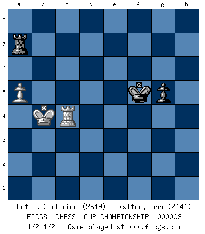 Last move : 1/2-1/2 2020 September 7 0:59:5 [Event "FICGS__CHESS__CUP_CHAMPIONSHIP__000003"] [Site "FICGS"] [Date "2020.07.01"] [Round "1"] [White "Ortiz,Clodomiro"] [Black "Walton,John"] [Result "1/2-1/2"] [WhiteElo "2519"] [BlackElo "2141"] 1.Nf3 Nf6 2.d4 g6 3.c4 Bg7 4.Nc3 d5 5.cxd5 Nxd5 6.e4 Nxc3 7.bxc3 c5 8.Rb1 O-O 9.Be2 cxd4 10.cxd4 Qa5+ 11.Qd2 Qxd2+ 12.Bxd2 b6 13.Rc1 Bb7 14.Bd3 Rd8 15.Ke2 Na6 16.Be3 Rac8 17.a3 e6 18.g4 Nb8 19.Rxc8 Rxc8 20.g5 Nc6 21.Rb1 Rd8 22.Rc1 a6 23.a4 Kf8 24.h4 Ke8 25.Rd1 Rd7 26.Rd2 Ke7 27.Bb1 a5 28.Ke1 Rd6 29.Kd1 Nb4 30.Ne5 Rd8 31.f4 Rc8 32.d5 Bxe5 33.fxe5 exd5 34.Bxb6 Ra8 35.Rd4 dxe4 36.Bc5+ Ke6 37.Bxb4 axb4 38.Rxb4 Ra7 39.Bxe4 Bxe4 40.Rxe4 Kf5 41.Rc4 Kxe5 42.Kc2 f5 43.gxf6 Kxf6 44.Kb3 h6 45.Kb4 Kf5 46.a5 g5 47.hxg5 hxg5 1/2-1/2 Reti Opening Kingside Castling by player Black (move 8) 10 pieces endgame at move 41 : White KRPPP , Black KRPPP WHITE : King + 1 Rook 3 Pawns BLACK : King + 1 Rook 3 Pawns 9 pieces endgame at move 43 : White KRPPP , Black KRPP WHITE : King + 1 Rook 3 Pawns BLACK : King + 1 Rook 2 Pawns 8 pieces endgame at move 43 : White KRPP , Black KRPP WHITE : King + 1 Rook 2 Pawns BLACK : King + 1 Rook 2 Pawns 7 pieces endgame at move 47 : White KRPP , Black KRP WHITE : King + 1 Rook 2 Pawns BLACK : King + 1 Rook 1 Pawn 6 pieces endgame at move 47 : White KRP , Black KRP WHITE : King + 1 Rook 1 Pawn BLACK : King + 1 Rook 1 Pawn This chess game ended in a draw. Follow this game move after move (download)Combinations have always been the most intriguing aspect of Chess. The masters look for them, the public applauds them, the critics praise them. It is because combinations are possible that Chess is more than a lifeless mathematical exercise. They are the poetry of the game; they are to Chess what melody is to music. They represent the triumph of mind over matter. (Reuben Fine) Oft bringt ein stiller Zug das Erdbeben. (Richard Reti) Tu no necesitas jugar muy bien, únicamente ayudar a tu oponenet a que juegue muy mal. (Genrikh Chepukaitis) Les Echecs mettent en conflit, non pas deux intelligences, mais deux volontés. (Lasker) Vladimir Ras-Putin is still alive... He is also a good actor, I saw him in the Lord of the Rings. (Rodolfo d'Ettorre)