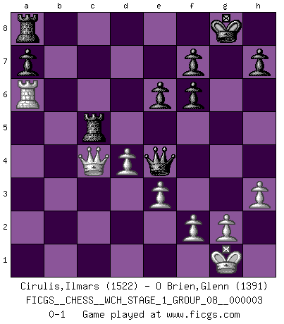 Last move : 0-1 2007 September 29 4:26:37 [Event "FICGS__CHESS__WCH_STAGE_1_GROUP_08__000003"] [Site "FICGS"] [Date "2007.07.11"] [Round "1"] [White "Cirulis,Ilmars"] [Black "O Brien,Glenn"] [Result "0-1"] [WhiteElo "1522"] [BlackElo "1391"] 1.d4 d5 2.Bf4 Nf6 3.Nc3 Bf5 4.e3 e6 5.Bd3 Bxd3 6.Qxd3 c6 7.Nf3 Nbd7 8.a3 Be7 9.O-O O-O 10.h3 c5 11.Rfb1 Qb6 12.b4 cxb4 13.axb4 Rfc8 14.Na4 Qc6 15.Nc5 Nxc5 16.bxc5 Nd7 17.Ne5 Nxe5 18.Bxe5 Bf6 19.Bxf6 gxf6 20.c4 dxc4 21.Qxc4 b6 22.Ra6 Qe4 23.Rb5 bxc5 24.Rxc5 Rxc5 0-1 This chess game has been lost on time (started : 2007.07.11 17:0:48) Queen's pawn, Mason variation Kingside Castling by player White (move 9) Kingside Castling by player Black (move 9) Player Black won this chess game. Follow this game move after move (download)Chess is a terrific way for kids to build self image and self esteem. (Saudin Robovic) Wir können eben der zündenden Macht des Opfers nicht wiederstehen, denn die Begeisterung für das Opfer liegt in der Natur des Menschen. (Rudolf Spielmann) Cualquier cambio de material en una posición debe venir por medio de un mate, una captura o promoción de Peón. (Purdy) Demandez au pauvre Cg1 ce qu'il en pense. Eduard Gufeld à propos de la variante Saemisch de l'Est-Indienne. A shortcut is the longest distance between two points. (Don Groves)