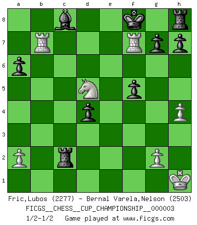 Last move : 1/2-1/2 2020 September 28 16:43:33 [Event "FICGS__CHESS__CUP_CHAMPIONSHIP__000003"] [Site "FICGS"] [Date "2020.07.01"] [Round "1"] [White "Fric,Lubos"] [Black "Bernal Varela,Nelson"] [Result "1/2-1/2"] [WhiteElo "2277"] [BlackElo "2503"] 1.d4 e6 2.e4 d5 3.Nc3 Nf6 4.e5 Nfd7 5.f4 c5 6.Nf3 cxd4 7.Nxd4 Nc6 8.Be3 Qb6 9.Qd2 Qxb2 10.Rb1 Qa3 11.Bb5 Nxd4 12.Bxd4 a6 13.Bxd7+ Bxd7 14.Rb3 Qe7 15.Rxb7 Rc8 16.f5 Qd8 17.O-O exf5 18.Qe3 Rc4 19.e6 fxe6 20.Nxd5 Bd6 21.Kh1 Qh4 22.Nf4 Qe7 23.Rd1 e5 24.Nd5 exd4 25.Qxe7+ Bxe7 26.Re1 Rxc2 27.Rxe7+ Kf8 28.h4 Bc8 29.Rf7+ 1/2-1/2 Queen's pawn Kingside Castling by player White (move 17) This chess game ended in a draw. Follow this game move after move (download)Chess is a fairy tale of 1001 blunders. (Savielly Tartakower) Das Schachspiel übertrifft alle anderen Spiele so weit wie der Chimborasso einen Misthaufen. (Arthur Schopenhauer) Tu sabes que vas a perder. Aún cuando tenía la ventaja, yo sabía que iba a perder. - al estar jugando con Fischer (Andrew Soltis) Celui qui prend des risques peut perdre, celui qui n'en prend pas perd toujours. (Xavier Tartacover) Somewhere in the world there is an epigram for every dilemma. (Hendrik Willem van Loon)