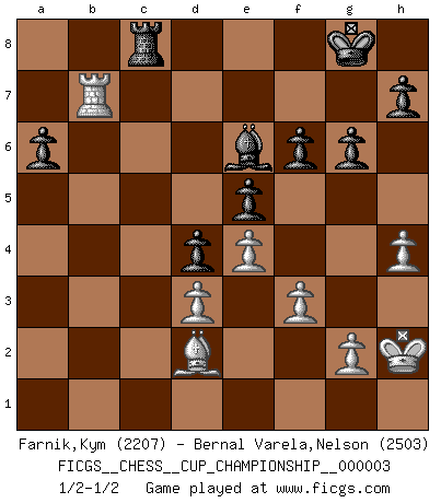 Last move : 1/2-1/2 2020 September 22 16:35:9 [Event "FICGS__CHESS__CUP_CHAMPIONSHIP__000003"] [Site "FICGS"] [Date "2020.07.01"] [Round "1"] [White "Farnik,Kym"] [Black "Bernal Varela,Nelson"] [Result "1/2-1/2"] [WhiteElo "2207"] [BlackElo "2503"] 1.d4 e6 2.Bf4 c5 3.e3 Qb6 4.Nc3 Nf6 5.Nf3 a6 6.dxc5 Qxc5 7.Bd3 d6 8.O-O Nbd7 9.Nd2 Be7 10.Nce4 Nxe4 11.Nxe4 Qc6 12.Qg4 Bf8 13.Qh5 d5 14.Ng5 g6 15.Qe2 e5 16.e4 d4 17.Bd2 f6 18.Nf3 Nc5 19.Rfc1 Nxd3 20.cxd3 Qe6 21.h4 Bd6 22.Bh6 Rg8 23.Nd2 Bd7 24.Nc4 Bc7 25.Ne3 Bc6 26.Nd5 Bd6 27.Nb6 Rd8 28.Bd2 Bc7 29.Na4 Bd6 30.Nc5 Qe7 31.Nb3 Bd7 32.Na5 Be6 33.Nc4 Bc7 34.Rab1 Kf7 35.Na5 Rb8 36.b4 Bxa2 37.Rb2 Be6 38.b5 Rgc8 39.bxa6 Bxa5 40.Rxc8 Rxc8 41.Bxa5 bxa6 42.Qd2 Qc5 43.Rb7+ Kg8 44.Kh2 Qc1 45.f3 Qxd2 46.Bxd2 1/2-1/2 Queen's pawn Kingside Castling by player White (move 8) This chess game ended in a draw. Follow this game move after move (download)It was clear to me that the vulnerable point of the American Grandmaster (Bobby Fischer) was in double-edged, hanging, irrational positions, where he often failed to find a win even in a won position. (Efim Geller) Es macht mich traurig, wenn ich sehe, dass Golfprofis mehr verdienen als Schachsportler. Obwohl ich davon überzeugt bin, dass wir Schachspieler viel härter trainieren müssen als die Golfer. (Alexandra Kosteniuk) Tu eres para mi la Reina en d8 y yo soy el Peón en d7!!. (GM Eduard Gufeld) Ce qui est bien, c'est d'avoir tout un tas de pièces en prise : l'adversaire ne peut en prendre qu'une à la fois. Cité par Thierry Audin. A computer lets you make more mistakes faster than any invention in human history - with the possible exceptions of handguns and tequila. (Mitch Ratcliffe)