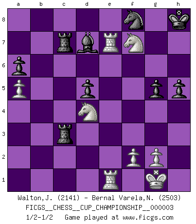 Last move : 1/2-1/2 2020 September 21 2:36:53 [Event "FICGS__CHESS__CUP_CHAMPIONSHIP__000003"] [Site "FICGS"] [Date "2020.07.01"] [Round "1"] [White "Walton,John"] [Black "Bernal Varela,Nelson"] [Result "1/2-1/2"] [WhiteElo "2141"] [BlackElo "2503"] 1.d4 e6 2.e4 d5 3.e5 c5 4.c3 Qb6 5.Nf3 Nc6 6.a3 Nge7 7.dxc5 Qc7 8.Bb5 Ng6 9.b4 Be7 10.Bxc6+ Qxc6 11.O-O O-O 12.a4 b6 13.h4 bxc5 14.h5 Nh8 15.bxc5 Qxc5 16.Re1 h6 17.Ba3 Qc7 18.Bxe7 Qxe7 19.Qd4 f6 20.exf6 Qxf6 21.Na3 a6 22.a5 Qf7 23.Qe5 g5 24.Nc2 Qxh5 25.Ncd4 Qf7 26.Ra2 Ra7 27.Qd6 Qe7 28.Qg3 Qf6 29.Rae2 Qf4 30.Qxf4 Rxf4 31.Nxe6 Rc4 32.Re3 Ng6 33.Nfd4 Nf8 34.Nd8 Rac7 35.Re8 Bd7 36.R8e7 Rxc3 37.Nf7 h5 38.Nh6+ Kh8 39.Nf7+ 1/2-1/2 Queen's pawn Kingside Castling by player White (move 11) Kingside Castling by player Black (move 11) This chess game ended in a draw. Follow this game move after move (download)A big shock; the best chess player in history has passed away. (Lajos Portisch, about Bobby Fischer's death) In Buenos Aires ist es nicht mein vorrangiges Ziel ein starkes Turnier zu organisieren, sondern ein Turnier für Gentlemen. Ich würde nie Kamsky einladen. Ich mag keine Probleme. (Miguel Najdorf) Una compensación adecuada por un sacrificio es tener una combinación sólida que conduce a una posición ganadora; una compensación adecuada por una metida de pata es dejar a tu oponente arrebatar una derrota de las fauces de la victoria. (Bruce A. Moon) J'ai toujours senti une vague pitié pour l'homme qui ne connaît rien aux échecs, tout comme j'en aurais pour un homme ignorant de l'amour. Les Echecs, comme la musique ou comme l'amour, ont le pouvoir de rendre heureux. (Siegbert Tarrasch) Memory is a way of holding onto the things you love, the things you are, the things you never want to lose. (from the television show: The Wonder Years)