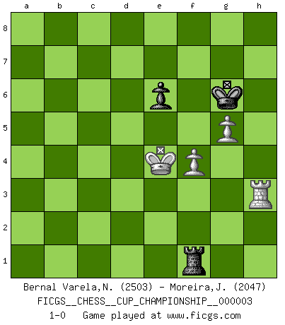 Last move : 1-0 2021 January 19 12:52:8 [Event "FICGS__CHESS__CUP_CHAMPIONSHIP__000003"] [Site "FICGS"] [Date "2020.07.01"] [Round "1"] [White "Bernal Varela,Nelson"] [Black "Moreira,Jose"] [Result "1-0"] [WhiteElo "2503"] [BlackElo "2047"] 1.Nf3 Nf6 2.d4 d5 3.c4 e6 4.Nc3 dxc4 5.e4 Bb4 6.Bg5 Bxc3+ 7.bxc3 h6 8.Bxf6 Qxf6 9.Bxc4 c5 10.O-O O-O 11.Qd3 cxd4 12.cxd4 Nc6 13.Rac1 Bd7 14.Qe3 Rac8 15.h4 a6 16.Bd3 Qe7 17.Bb1 Qb4 18.e5 Ne7 19.Qe4 g6 20.Rxc8 Rxc8 21.Qf4 Kg7 22.Qf6+ Kg8 23.h5 Nd5 24.Qh4 gxh5 25.Qxh5 Qf8 26.Qh4 Qg7 27.Be4 a5 28.Kh2 Bc6 29.Rc1 Rf8 30.Rc5 a4 31.a3 Rb8 32.g3 Nc7 33.Nd2 Qg5 34.Qxg5+ hxg5 35.Bxc6 bxc6 36.Rxc6 Nb5 37.Rc4 Ra8 38.Nb1 Rd8 39.Rxa4 Nxd4 40.Nd2 Kg7 41.Kg2 Rd5 42.Rc4 Nb5 43.a4 Rxd2 44.axb5 Rb2 45.Rc5 Rb4 46.Kf3 Kg6 47.Ke2 g4 48.Ke3 Kf5 49.Rc7 Rxb5 50.Rxf7+ Kxe5 51.Rf4 Rb3+ 52.Ke2 Ra3 53.Kf1 Rd3 54.Rxg4 Kf5 55.Rh4 Rb3 56.Rf4+ Kg6 57.Kg2 Kg5 58.Ra4 Rb2 59.Ra5+ Kf6 60.g4 Rb4 61.f3 Rb3 62.f4 Rb2+ 63.Kg3 Rb3+ 64.Kh4 Rb1 65.g5+ Kg6 66.Re5 Kf7 67.Kg3 Rb3+ 68.Kf2 Rb1 69.Re3 Ra1 70.Rc3 Kg6 71.Kf3 Kf5 72.Rc5+ Kg6 73.Re5 Kf7 74.Re4 Rg1 75.Re3 Rf1+ 76.Ke4 Kg6 77.Rh3 1-0 This chess game has been lost on time (started : 2020.07.01 11:2:5) Follow this game move after move (download)Chess is thirty to forty percent psychology. You don't have this when you play a computer. I can't confuse it. (Judith Polgar) Ich verstehe Aljechins Kombinationen ganz gut; aber woher er diese Angriffschancen bekommt und wie er die Eröffnung behandelt das ist für mich ein Buch mit sieben Siegeln. (Rudolf Spielmann) Evita las multitudes. Haz independientemente tu propio razonamiento. Trata de ser el jugador de Ajedrez, no la pieza de Ajedrez. (Ralph Charell) À la honte des hommes, on sait que les lois du jeu sont les seules qui soient partout justes, claires, inviolables et exécutées. Pourquoi l'Indien qui a donné les règles du jeu d'échecs est-il obéi de bon gré dans toute la terre, et que les décrétales des papes, par exemple, sont aujourd'hui un objet d'horreur et de mépris ? C'est que l'inventeur des échecs combina tout avec justesse pour la satisfaction des joueurs, et que les papes, dans leurs décrétales, n'eurent en vue que leur seul avantage. L'Indien voulut exercer également l'esprit des hommes et leur donner du plaisir; les papes ont voulu abrutir l'esprit des hommes. Voltaire (Dictionnaire philosophique / Garnier 1967) You think that education is too expensive ? Try ignorance. (Derek Bok)