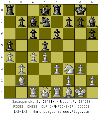 Last move : 1/2-1/2 2020 September 5 13:2:58 [Event "FICGS__CHESS__CUP_CHAMPIONSHIP__000003"] [Site "FICGS"] [Date "2020.07.01"] [Round "1"] [White "Szczepanski,Zbigniew"] [Black "Wosch,Arkadiusz"] [Result "1/2-1/2"] [WhiteElo "2491"] [BlackElo "2475"] 1.Nf3 Nf6 2.b3 d5 3.Bb2 Bf5 4.c4 e6 5.g3 c6 6.Bg2 Nbd7 7.O-O h6 8.d4 Be7 9.a3 O-O 10.Re1 Re8 11.e3 a5 12.Nc3 Ne4 13.Nxe4 Bxe4 14.Bf1 Bf5 15.Rc1 Bd6 16.Nh4 Bh7 17.Nf3 Bc7 18.a4 1/2-1/2 Reti Opening Kingside Castling by player White (move 7) Kingside Castling by player Black (move 9) This chess game ended in a draw. Follow this game move after move (download)During a Chess competition a Chessmaster should be a combination of a beast of prey and a monk. (Alexander Alekhine) Ich hatte meine größten Erfolge, als ich 47 Jahre alt war. Kasparow war noch nicht mal 42 und hat das Schach schon im Stich gelassen. (Viktor Kortschnoi) A través de las casillas del tablero, los Indios explican el movimiento del tiempo y la edad, las influencias mas altas que controlan el mundo y los lazos que vinculan al Ajedrez con el alma humana. (Al-Masudi) Les sacrifices démontrent seulement que quelqu'un a gaffé. (Savielly Tartacover) You can't play chess if you're groggy from pills. (Anatoly Karpov)