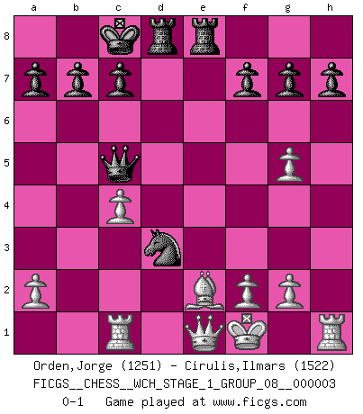 Last move : 0-1 2007 August 9 13:11:25 [Event "FICGS__CHESS__WCH_STAGE_1_GROUP_08__000003"] [Site "FICGS"] [Date "2007.07.11"] [Round "1"] [White "Orden,Jorge"] [Black "Cirulis,Ilmars"] [Result "0-1"] [WhiteElo "1251"] [BlackElo "1522"] 1.e4 e5 2.Nf3 Nc6 3.Nc3 Nf6 4.d3 d5 5.Bg5 d4 6.Nd5 Be6 7.c4 dxc3 8.bxc3 Bxd5 9.exd5 Qxd5 10.c4 Bb4+ 11.Bd2 Qd6 12.Be2 e4 13.dxe4 Nxe4 14.Bxb4 Qxb4+ 15.Kf1 Qc5 16.Qe1 O-O-O 17.Rc1 Rhe8 18.h4 Nb4 19.Ng5 Nxg5 20.hxg5 Nd3 0-1 Four knights game Queenside Castling by player Black (move 16) Player Black won this chess game. Follow this game move after move (download)An attack on the wing should be met by play in the center. (Nimzovitch) Es ist nicht das erste mal, dass sich die FIDE dem Arabischen Geld gebeugt hat (über die FIDE WM 2004 in Lybien). (Larry Evans) Por esta medida (el intervalo entre Fischer y sus contemporaneos), yo le considero el mas grande campeón mundial. (Garry Kasparov) Il a essayé de se convaincre qu'il pourrait empêcher toutes les erreurs et ne jamais perdre. L'horreur ! Gary Kasparov au sujet de Robert Fischer. Wisdom begins at the end. (Daniel Webster)