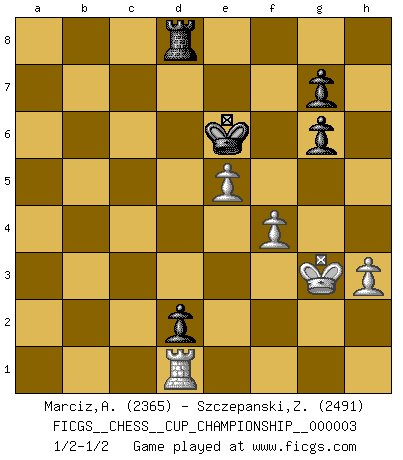 Last move : 1/2-1/2 2020 July 25 10:53:6 [Event "FICGS__CHESS__CUP_CHAMPIONSHIP__000003"] [Site "FICGS"] [Date "2020.07.01"] [Round "1"] [White "Marciz,Alexander"] [Black "Szczepanski,Zbigniew"] [Result "1/2-1/2"] [WhiteElo "2365"] [BlackElo "2491"] 1.e4 e5 2.Nf3 Nc6 3.Bb5 Nf6 4.d3 Bc5 5.c3 d5 6.d4 exd4 7.e5 Ne4 8.cxd4 Bb6 9.Nc3 O-O 10.Be3 Bg4 11.h3 Bh5 12.Qc2 Nxc3 13.bxc3 f6 14.exf6 Qxf6 15.Be2 Na5 16.O-O Rae8 17.Ne5 Bxe2 18.Qxe2 Qe6 19.Rab1 c6 20.f4 Bc7 21.Rbe1 Nc4 22.Qc2 Qc8 23.Bc1 Bd6 24.Re2 b5 25.Qd3 Be7 26.a4 Qb7 27.g4 Bd6 28.Kg2 Re7 29.Rfe1 Rfe8 30.axb5 cxb5 31.g5 b4 32.g6 hxg6 33.cxb4 Bxb4 34.Rg1 Nxe5 35.dxe5 Re6 36.Kh2 Qa6 37.Rg3 Qxd3 38.Rxd3 Rd8 39.Bd2 a5 40.Bxb4 axb4 41.Rd4 Rb6 42.Rb2 b3 43.Rd3 Kf7 44.Rdxb3 Rxb3 45.Rxb3 d4 46.Kg3 d3 47.Rb1 d2 48.Rd1 Ke6 1/2-1/2 Ruy Lopez : Berlin defense Kingside Castling by player Black (move 9) Kingside Castling by player White (move 16) 10 pieces endgame at move 45 : White KRPPP , Black KRPPP WHITE : King + 1 Rook 3 Pawns BLACK : King + 1 Rook 3 Pawns This chess game ended in a draw. Follow this game move after move (download)Chess is life. (Bobby Fischer) Immer nach dem besten Zug zu suchen ist ziemlich unpraktisch. (Nigel Short) El Ajedrez tiene tanto misterio como las mujeres. (Purdy) Un millionnaire : 'Monsieur Steinitz ! Vous ne participez aux tournois que pour l'argent, alors que moi je n'y viens que pour l'honneur.' Steinitz : 'Chacun joue pour ce qu'il n'a pas'... Everything in life is luck. (Donald Trump)