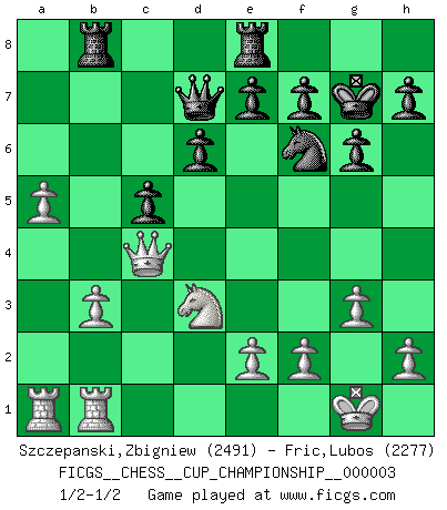 Last move : 1/2-1/2 2020 August 5 19:24:48 [Event "FICGS__CHESS__CUP_CHAMPIONSHIP__000003"] [Site "FICGS"] [Date "2020.07.01"] [Round "1"] [White "Szczepanski,Zbigniew"] [Black "Fric,Lubos"] [Result "1/2-1/2"] [WhiteElo "2491"] [BlackElo "2277"] 1.Nf3 Nf6 2.b3 g6 3.Bb2 Bg7 4.g3 d6 5.d4 b5 6.Bg2 Bb7 7.O-O Nbd7 8.Na3 a6 9.c4 Rb8 10.d5 O-O 11.Ne1 Re8 12.cxb5 axb5 13.Nxb5 Bxd5 14.Bxd5 Nxd5 15.Bxg7 Rxb5 16.a4 Rb8 17.Qxd5 Kxg7 18.Nd3 c5 19.a5 Nf6 20.Qc4 Qd7 21.Rfb1 1/2-1/2 Reti Opening Kingside Castling by player White (move 7) Kingside Castling by player Black (move 10) This chess game ended in a draw. Follow this game move after move (download)I like the moment when I break a man's ego. (Bobby Fischer) Ich habe Putins Aufstieg an die Macht beobachtet und seine Politik, die demokratischen Institutionen meines Landes zu zerstören. (Garry Kasparov) Mi estilo es algo parecido entre un poco de Tal y Petrosian. (Reshevsky) Je menace de comprendre la position. (Anonyme) You have to believe in yourself. (Sun Tzu)
