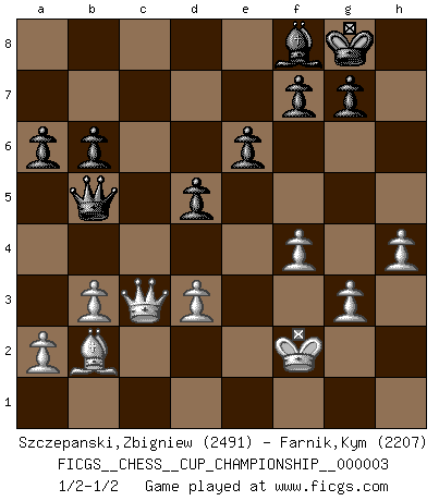 Last move : 1/2-1/2 2020 July 24 9:19:11 [Event "FICGS__CHESS__CUP_CHAMPIONSHIP__000003"] [Site "FICGS"] [Date "2020.07.01"] [Round "1"] [White "Szczepanski,Zbigniew"] [Black "Farnik,Kym"] [Result "1/2-1/2"] [WhiteElo "2491"] [BlackElo "2207"] 1.Nf3 Nf6 2.b3 d5 3.Bb2 Bf5 4.c4 e6 5.g3 c6 6.Nh4 Be4 7.f3 Bg6 8.e3 Be7 9.Nc3 O-O 10.Nxg6 hxg6 11.f4 Na6 12.cxd5 cxd5 13.Bxa6 bxa6 14.O-O Rc8 15.Na4 Qa5 16.d3 Rc6 17.Rc1 Rfc8 18.Rxc6 Rxc6 19.Qe2 Nd7 20.Rc1 Rxc1+ 21.Bxc1 g5 22.Qd2 Qd8 23.Bb2 Nb6 24.Qa5 Qd6 25.Kf2 gxf4 26.exf4 Nd7 27.Qc3 Bf8 28.Qd4 Nb6 29.Nxb6 axb6 30.h4 Qc6 31.Qc3 Qb5 1/2-1/2 Reti Opening Kingside Castling by player Black (move 9) Kingside Castling by player White (move 14) This chess game ended in a draw. Follow this game move after move (download)Chess is war over the board. The object is to crush the opponents mind. (Bobby Fischer) Rubinstein ist ein Turmendspiel, welches die Götter vor tausenden von Jahren begannen. (Savielly Grigorievitsch Tartakower) Haz el enroque temprano y seguido. (Rob Sillars) A ce moment-là, je menaçais de comprendre la position ! (Clément L'Heureux) In fact if nothing is done against this teddy bear, hereby I announce that I would quit chess, rapid chess, blitz chess, postal chess, email chess, server chess and correspondence chess I will then switch to a table game where teddy bears aren't going to be seen for a while, like Poker, or Roulette, all 18+ games. (Elmer Valderrama)