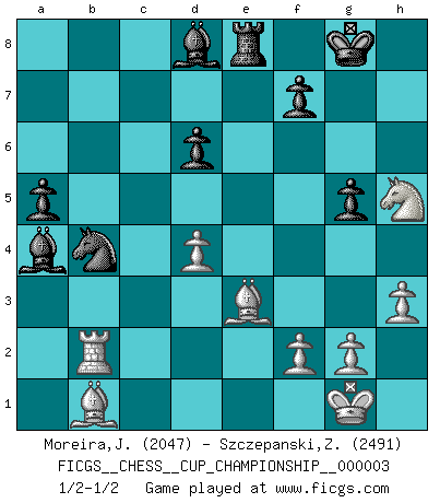 Last move : 1/2-1/2 2020 July 29 21:12:12 [Event "FICGS__CHESS__CUP_CHAMPIONSHIP__000003"] [Site "FICGS"] [Date "2020.07.01"] [Round "1"] [White "Moreira,Jose"] [Black "Szczepanski,Zbigniew"] [Result "1/2-1/2"] [WhiteElo "2047"] [BlackElo "2491"] 1.e4 e5 2.Nf3 Nc6 3.Bc4 Bc5 4.d3 Nf6 5.O-O d6 6.c3 O-O 7.Bb3 h6 8.h3 Bd7 9.Bc2 b5 10.a4 a6 11.Re1 Ba7 12.Nbd2 Re8 13.Nf1 b4 14.d4 bxc3 15.bxc3 Bb6 16.Ng3 Rb8 17.Rb1 Ba5 18.Re3 Rxb1 19.Bxb1 Bb6 20.Ba2 Qe7 21.Re1 Qd8 22.Re2 Qa8 23.Kh2 Qd8 24.Kg1 a5 25.Bb1 Nh7 26.Be3 Ng5 27.Nxg5 hxg5 28.Rb2 exd4 29.cxd4 Nb4 30.Qh5 Qf6 31.e5 Qh6 32.Qxh6 gxh6 33.exd6 Bxa4 34.Nf5 h5 35.Ng3 cxd6 36.Nxh5 Bd8 1/2-1/2 Giuoco Pianissimo Kingside Castling by player White (move 5) Kingside Castling by player Black (move 6) This chess game ended in a draw. Follow this game move after move (download)We must make sure that Chess will not be like a dead language, very interesting, but for a very small group. (Sytze Faber) Eine Person mit durchschnittlichem IQ kann etwa eine ELO von 2000 erreichen. (Jonathan Levitt) Un sacrificio se refuta mucho mejor al aceptarlo. (Wilhelm Steinitz) Demandez au pauvre Cg1 ce qu'il en pense. Eduard Gufeld à propos de la variante Saemisch de l'Est-Indienne. Horse racing is animated roulette. (Roger Kahn)